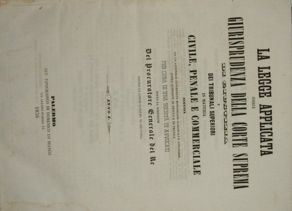 Ossia giurisprudenza della Corte Suprema di giustizia e dei Tribunali superiori in materia civile, penale e commerciale - Seguita da un appendice contenente monografie nazionali e straniere, sopra quistioni di diritto e di pratica. Per cura di una società di avvocati sotto la direzione del Procuratore Generale del Re - in 8° - pp.XXVII + 255 + 255 + 255; 128 + 160 - Mezza pelle con titolo e fregi in oro al dorso - Due volumi in un unico tomo - Testo su due colonne - Abrasioni e piccola mancanza al dorso - Vol. I: Anno I; Vol. II: Anno II