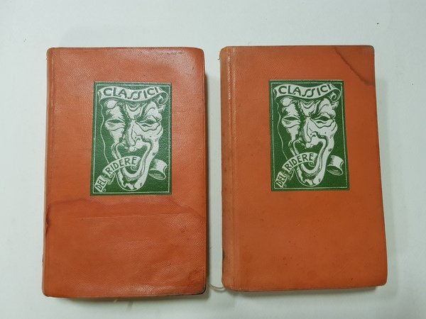2 volumi in 8vo; pp. XXIV, 350, 372; disegni b/n nel testo; simpaticissima legatura in tutta pelle morbida arancione con tasselli verdi raffiguranti la maschera dell'arte drammatica e il titolo della collana ai piatti anteriori; numero della collana al dorso; capitelli; segnalibri; mantenute le copertine originali.<BR>Copertine macchiate; leggera fioritura agli sguardi dello secondo volume; per il resto in buono stato.<BR>Prima edizione; collana I Classici del Ridere n. 21, 25.<BR>