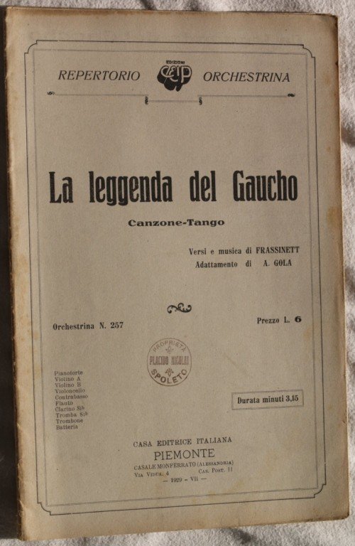 In 8. cm 27x18,5. pp 13. partitura completa per orchestra del 1929 di una canzone. Caratteristica copertina illustrata d'epoca. Ex libris sulla copertina. In buone condizioni. a complete score for orchestra of 1929. Carachteristic decorated cover of that period. Ex libris in the cover. In good conditions.
