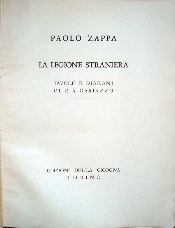 In-4° (32 x 24 cm), pp. 125, (3), copertina muta in cartoncino, con normali segni d'uso. Oltre alla copertina editoriale, mancano la sovraccoperta e la custodia editoriali. Con 16 tavole fuori testo protette da velina e molte illustrazioni nel testo, disegnate, in bianco e nero, da Pier Antonio Gariazzo. In stato di conservazione molto buono. Edizione di pregio, non comune. Suggestive le tavole, di grande effetto. Dell'opera vennero stampate 500 copie su carta Ingres delle cartiere Pietro Miliani di Fabriano, numerate da 1 a 500, 54 copie su carte di lusso diverse numerate in cifre romane e riservate all'autore e ai suoi amici, 16 copie su carte di lusso diverse con una serie delle tavole acquarellate dall'artista e un disegno originale, contraddistinte con lettere alfabetiche da A ad R. Il presente esemplare è il numero 31 della tiratura in 500 copie. Racconto di un viaggio compiuto dallo Zappa in Marocco, nel 1931, al seguito di una colonna della Legione Straniera, che muoveva verso la regione di Meknès-Tafilalet per stroncare la resistenza degli ultimi indipendentisti marocchini. Così l'autore "Come aiuto del vivandiere, mi fu possibile, alcuni anni or sono, seguire, per circa trecento chilometri lungo la strada del Sud, una colonna della Legione Straniera in marcia verso il Tafilalet". Indice: La strada del Sud; L'azienda della disperazione; Storia della Legione e storielle di legionari; Oi Marì! Oi Marì!; La regola del sette; Anna Maria; Una sera di festa; Teste calde; Disertori davanti alla malinconia; La vita nel "bled"; L'amore nel "bled"; I mercenari della gloria.