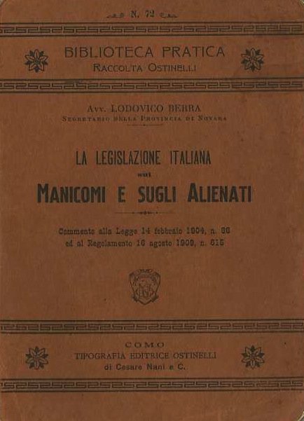 La legislazione italiana sui manicomi e sugli alienati: commento alla Legge 14 febbraio 1904, n. 36 ed al Regolamento 16 agosto 1909, n. 615: circolari ministeriali, disposizioni legislative e regolamentari attinenti: moduli.