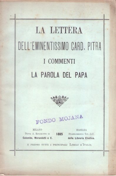 La lettera dell'Eminentissimo Card. Pitra, i commenti, la parola del Papa. 1885