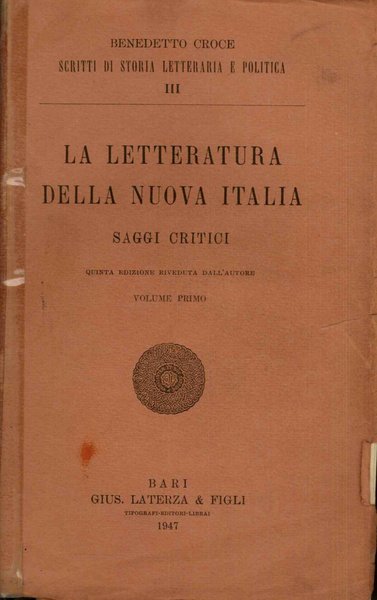 La letteratura della nuova Italia. Saggi critici. Volume Primo