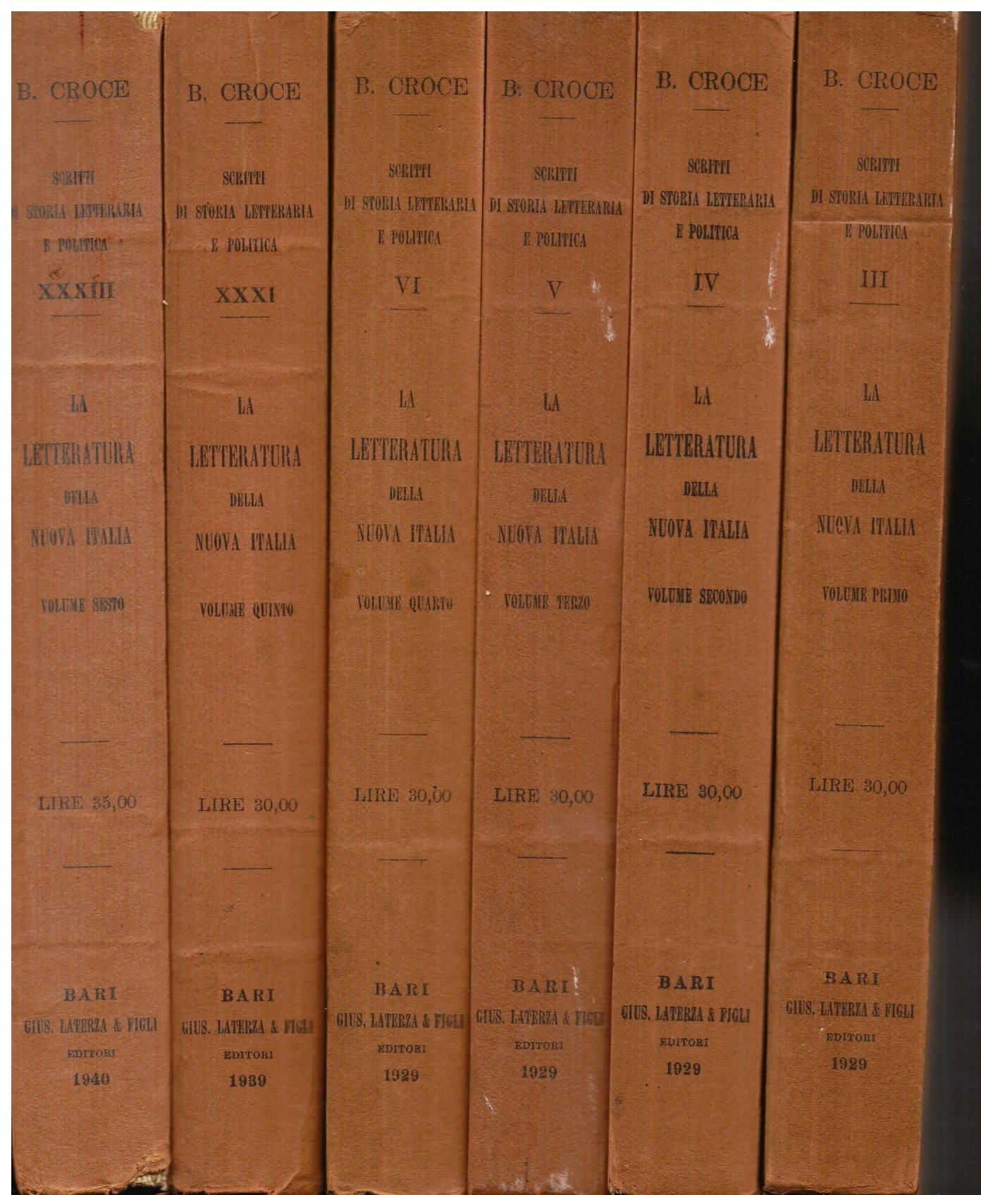 6 volumi in-8° (215x140mm), pp. 419, (5); 445, (3); 403, (5); 355, (5); 396, (4); 427; brossura editoriale color mattone con marca tipografica ai piatti. Perfetta copia a fogli chiusi. Prima edizione in volumi. Monumentale e tuttora imprescindibile opera crociana sulla letteratura italiana postrisorgimentale, nel periodo che egli amò definire, con nostalgico richiamo alla propria giovinezza trascorsa nell'età umbertina, della 'nuova Italia'. Partendo da Tommaseo e dagli ultimi cascami del romanticismo lirico di Prati e Aleardi, Croce allarga il suo raggio d'indagine ai grandi delle nostre lettere del tempo, Carducci come Pascoli (con il celebre ridimensionamento della sua poesia posteriore alle 'Myricae'), D'Annunzio come Verga, sino a toccare prosatori e poeti 'minori' e talora oggi quasi dimenticati, ma oltremodo significativi per la comprensione della cultura italiana del loro tempo e di certi suoi fermenti e tendenze. Trovandosi in molti casi a toccare di scrittori non ancora 'storicizzati', i giudizi crociani, talora acutissimi talora sfioranti l'incomprensione più severa (come nel caso del saggio su Pirandello), si pongono come autentiche pietre miliari, come i primi tentativi di un compiuto inquadramento critico di tali autori. I saggi, apparsi tutti in forma preoriginale su 'La Critica', iniziarono a essere raccolti in volume dal 1914 (il sesto volume non apparve che nel 1940).