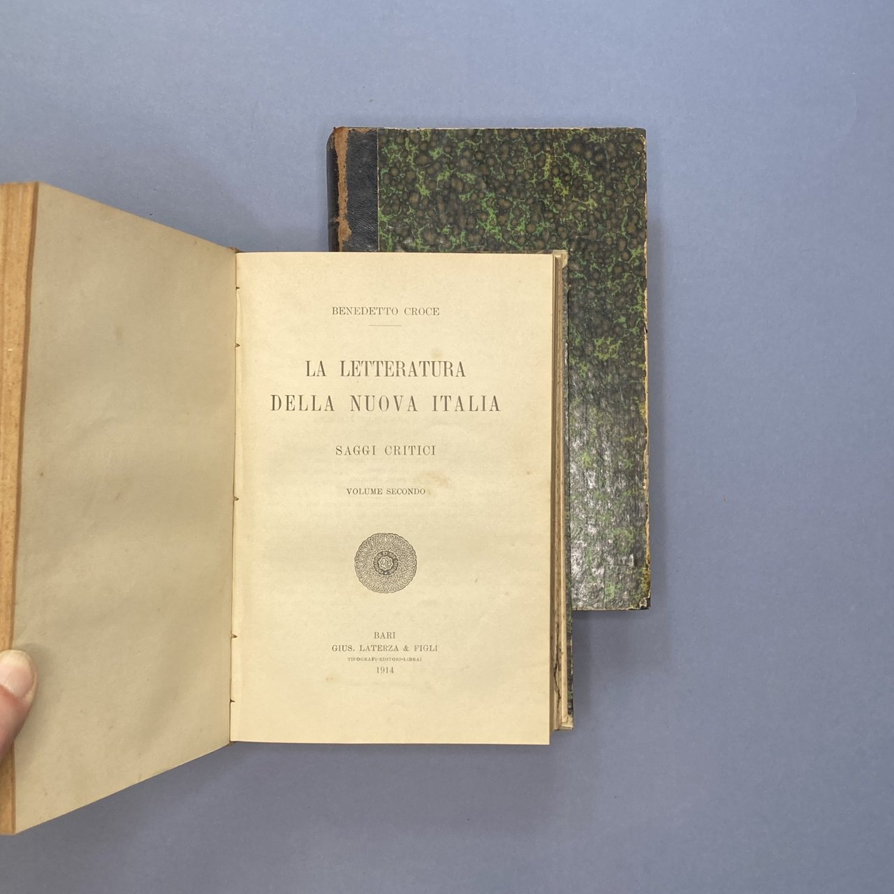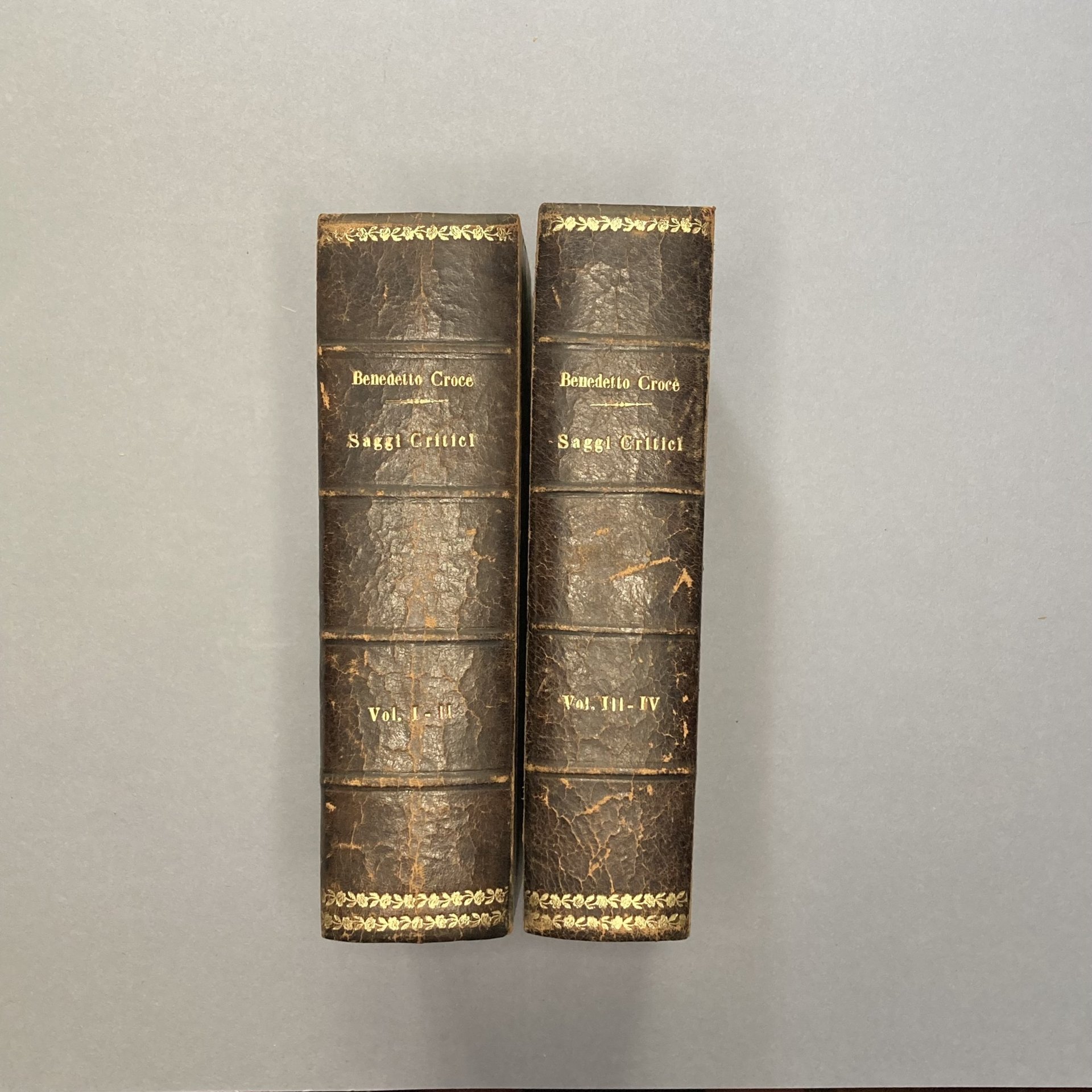 8°, cm 21, due volumi contenenti quattro tomi di pp. 422, 388, 402, 334. Rilegature in mezza pelle con titoli e fregi in oro al dorso. Edizione originale, i volumi cinque e sei, qui assenti, sono stati aggiunti in anni molto successivi alla prima pubblicazione. Testimonianza del tramonto del positivismo in seno al quale era nata per esempio la Storia della Letteratura del De Sanctis, i saggi crociani sono piuttosto l'espressione letteraria di quanto teorizzato nell'Estetica pubblicata nel 1902. Nei saggi, infatti, sono presi in esame gli autori di letteratura italiana dall'Unità al primo Novecento, non organicamente, ma ognuno a sé stante costituendo una specie di galleria di ritratti, in accordo con la preminenza dell'opera sul contesto storico che la filosofia idealista di Croce postulava.. *** TUTTI I NOSTRI LIBRI SONO VISIBILI PREVIO CONTATTO MAIL O TELEFONO NELLA NUOVA SEDE DI MILANO: LIBRERIA COSMOPOLIS, VIA JOMMELLI, 22. ***