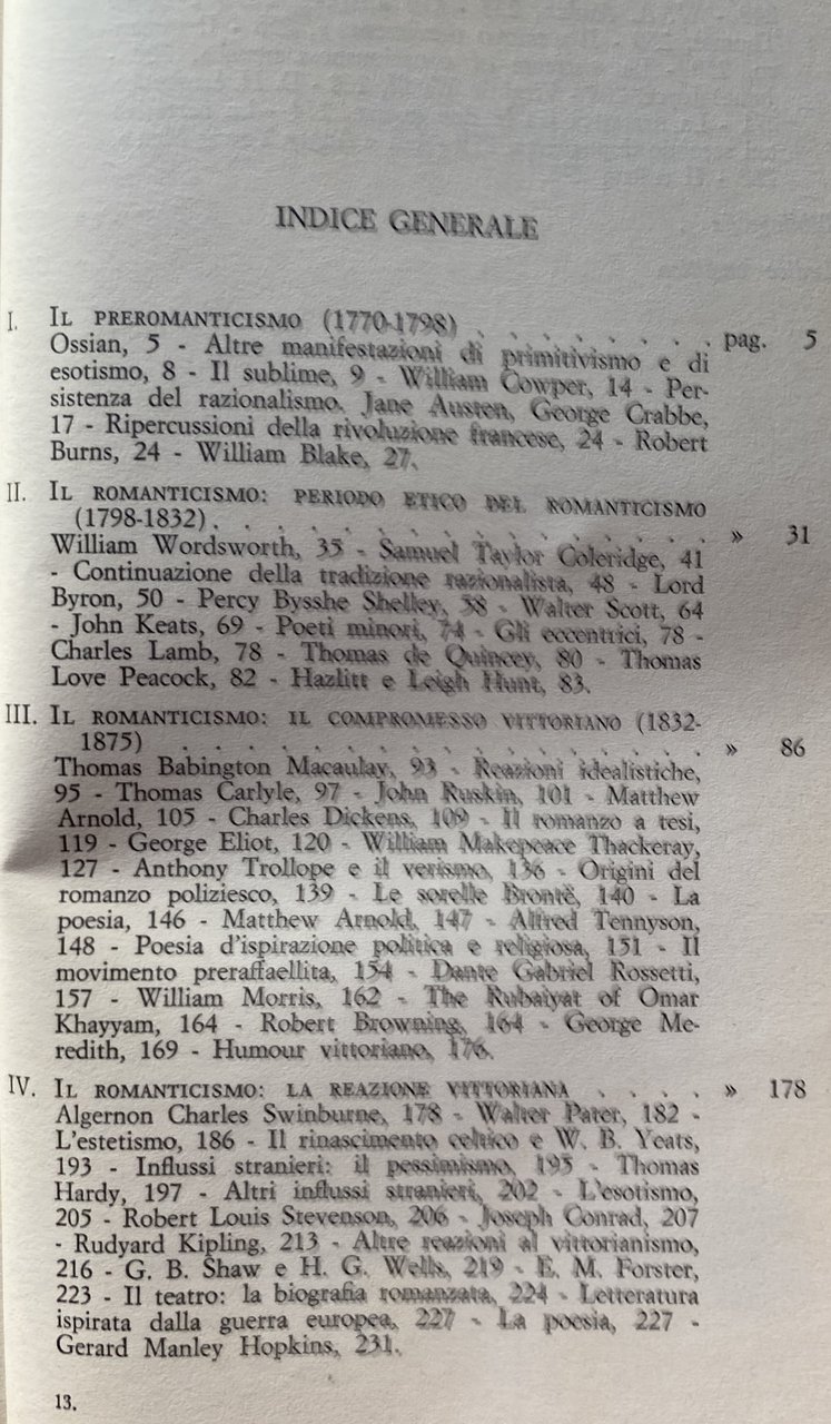 Soggetti: Anglistica, Studi culturali, Cultura anglosassone, Preromanticismo, Primitivismo, Critica letteraria, Saggi critici, Ossian, Esotismo, Sublime, William Cowper, Razionalismo, George Crabbe, Rivoluzione francese, Robert Burns, William Blake, Settecento, William Wordsworth, Samuel Taylor Coleridge, Lord Byron, Percy Bysshe Shelley, Walter Scott, John Keats, Poeti minori, Eccentrici, Charles Lamb, Thomas de Quincey, Thomas Love Peacock, Hazlitt Leigh Hunt, Puritanesimo, Età Vittoriana, Dandy, Thomas Babington Macaulay, Thomas Carlyle, John Ruskin, Matthew Arnold, Charles Dickens, Romanzo a tesi, George Eliot, Walt Whitman, William Makepeace Thackeray, Anthony Trollope, Verismo, Romanzo poliziesco, Sorelle Brontë, Poesia, Matthew Arnold, Alfred Tennyson, Politica, Religiosa, Movimento preraffaellita, Dante Gabriel Rossetti, William Morris, The Rubaiyat of Omar-Khayyam, Robert Browning, George Meredith, Humour vittoriano, Algernon Charles Swinburne, Walter Pater, Estetica, Rinascimento celtico W. B. Yeats Pessimismo Thomas Hardy Robert Louis Stevenson Joseph Conrad Rudyard Kipling Vittorianismo, G.B. Shaw H.G. Wells E. M. Forster Teatro Biografie romanzate Guerra Poetica Gerard Manley Hopkins Ansia T.S. Eliot Scuole W. A. Auden Apocalittici Dylan Thomas Nuovo movimento Romanzi Flusso di coscienza James Joyce Virginia Woolf, D.H. Lawrence Narrativa Angry Young Men Drammaturgia Bibliografia Riferimento Libri Vintage fuori catalogo Classici Enciclopedie E. Spenser Swinburne Taine R. Steele Torquato Tasso Sterne Lord Tennyson Industrializzazione Impero Regina Sturm und Drang Germania Italia Russia Turgenev Turner Peter Ustinov Voltaire Società Tourneur Virgilio Giambattista Vico H. Vaughan Conversazione Storico Rousseau Aristocrazia Popolare Royal Society Schlegel Sainte-Beuve Influenze straniere Ruskin Schopenhauer William Shakespeare Philip Sidney Smollett Sonetto elisabettiano Elisabetta Bernard Shaw Spectator Edgar Alla Poe Petrarca A. Pope Ezra Pound Colonie Americana India Puritani Puskin Marcel Proust Richardson G. Meredith Manierismo Metafisica Riforma Protestantesimo Chiesa anglicana Milton Mistery Plays Montale Montaigne Thomas More Nietzsche Orazio Omero George Orwell Melville Ovidio Musil Oxford C. Day Lewis Irlanda del Nord Scozia Leopardi Locke Machiavelli Maeterlinck Marvell Malone Mann Manzoni Holinshed Hobbes Hawthorne Heminges Umorismo nero Ironia Huxley Fantasy Fantascienza Huysmans Ibsen Kant Influsso Fletcher Flaubert Ugo Foscolo Gest Gautier André Gide Goethe Crashaw Dante Alighieri D'Annunzio Dodgson De Foe J. Donne Dostoevskij Arthur Conan Doyle Dryden Estetismo Grecia Cechov Carlyle Cervantes Chaucer Beckett Ballate Bacon Baretti Bergson Belleforest Baudelaire Blake Bibbia Anglomania Collezionismo Manuali Pickwick Oliver Twist Phineas Finn Re Lear Amleto Dramma Drammaturghi Satira Poemi Saggio Industria Progresso Waste Land Mary Barton Modernismo Narrativa Arte Personaggi Recensioni Realismo Beowulf Canterbury Tales English literature Cultural studies Anglo-Saxon culture Pre-Romanticism Primitivism Literary criticism Critical essays Exoticism Rationalism French Revolution Eighteenth century Minor poets Eccentrics, Puritanism Victorian Age Thesis novel Detective novel Sisters Poetry Politics Religious Pre-Raphaelite movement Aestheticism Celtic Renaissance Pessimism Victorianism Theatre Fictionalized biographies War Poetics Anxiety School, Apocalyptic New movement Novels Stream of consciousness Fiction Dramaturgy Bibliography Reference Books out of print Classics Encyclopedias Industrialization English Empire Queen Germany Italy Society Virgil Conversation Historical Aristocracy Popular Foreign influences Elizabethan Sonnet Petrarch Colonies Puritans Mannerism Metaphysics Reform Protestantism Anglican Church Homer Ovid Northern Ireland Scotland Irony Science Fiction Influence Aesthetics Greece Chekhov Ballads Bible Collectibles Manuals King Hamlet Drama Playwrights Satire Poems Essay Industry Progress Modernism Fiction Art Characters Reviews Realism