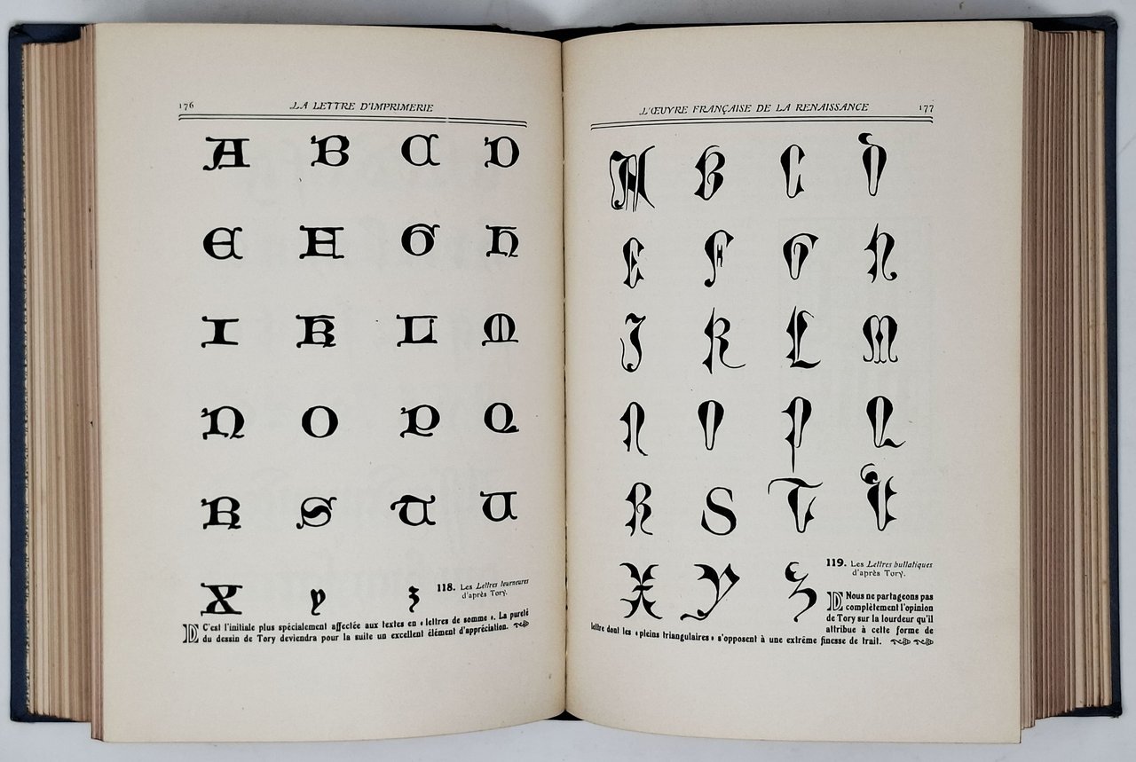 Preface de Georges Lecomte. Edizione originale. Imprimé sur pate d'Alfa des papeteries Berges. 'Achevé d'imprimer le 6 aout 1921, par G. De Malherbe & C., a Paris'. Lingua del testo: francese. Pagine: XXV + 698 +[24]. Formato: 16 x 22,5 cm circa. Stato di conservazione: qualche piccola macchiolina rossa sui piatti e leggera sgualcitura della tela sui margini del dorso, qualche raro e leggero ingiallimento ma, nel complesso, due buoni esemplari. Privi di firme d'appartenenza, timbri, annotazioni o altri segni nel testo. Copertine editoriali cartonate rigide in tutta tela azzurra, riccamente decorate sui piatti e sui dorsi. Unghia verniciata in rosso. Molto ricco e accattivante l'apparato iconografico dell'opera, con illustrazioni in bianco e nero nel testo e numerose tavole illustrate, in nero e a colori, fuori testo. Esaustiva e particolareggiata opera sulla stampa e l'arte tipografica, molto curata anche nella sua veste editoriale e sicuramente unica ed estremamente affascinante grazie al suo apparato iconografico. Al fondo del secondo tomo è presente la pubblicità di un'altra opera (che usciva come volume a se stante) 'Manuel francais de typographie Moderne' (sempre di F. Thibaudeau) in preparazione al momento dell'uscita di questa prima opera.