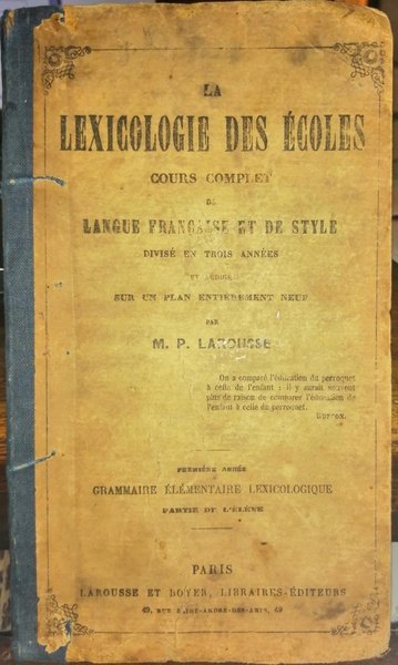 In-8 (17 cm) 228. Mezzatela editoriale. Trentesima edizione.Pierre Larousse (Toucy, 23 ottobre 1817 – Parigi, 3 gennaio 1875) è stato un linguista, pedagogista e editore francese, nonché enciclopedista e filantropo. French language. Lingua francese