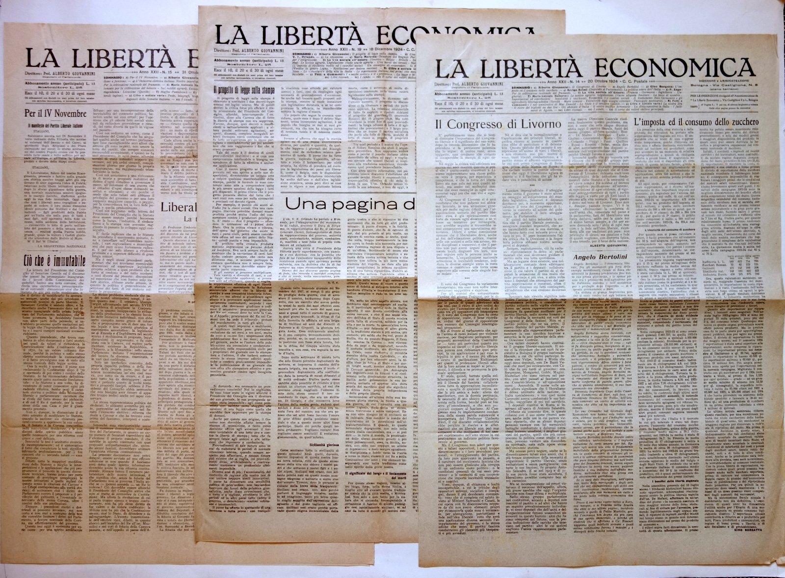 Giornale (3 numeri), La Libertà Economica" tre numeri Bologna, 20 ottobre 1924; 31 ottobre 1924; 18 dicembre 1924 Bologna 1924; cm 56x38,5; pp. 4 (tutti). Completi. Condizioni di conservazione Tutti e tre in buone condizioni con tracce d'uso, normali pieghe di conservazione, lieve ingiallimento dovuto al tipo di carta e alcune piccole lievi bruniture. Alcuni minimi marginali strappetti e pieghette / tracce di pieghette. Tre numeri completi. SC03.D18237 N F "