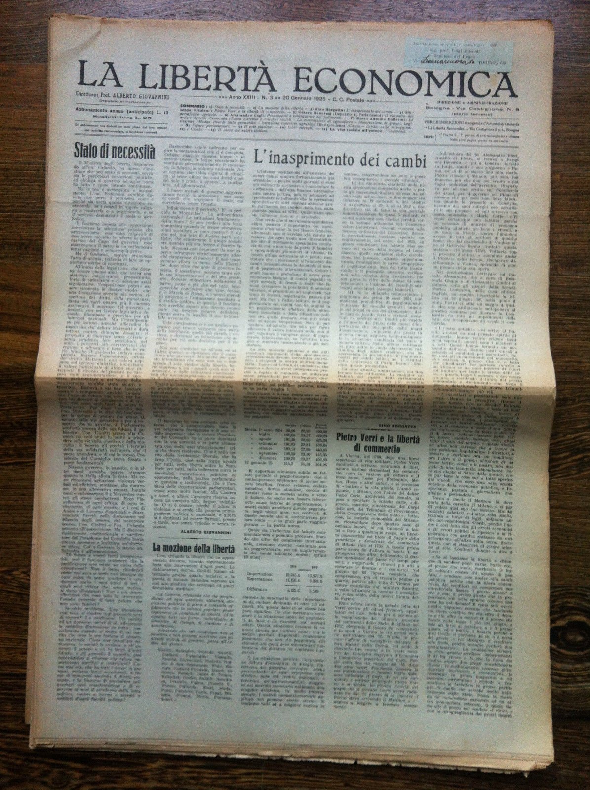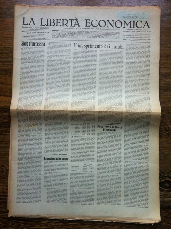 LA LIBERTA' ECONOMICADirettore Prof. Alberto GiovanniniCopia indirizzata in abbonamento al Sig. Prof. Luigi Einaudi Torino Senatore del RegnoIn buono stato (25 g)E11337
