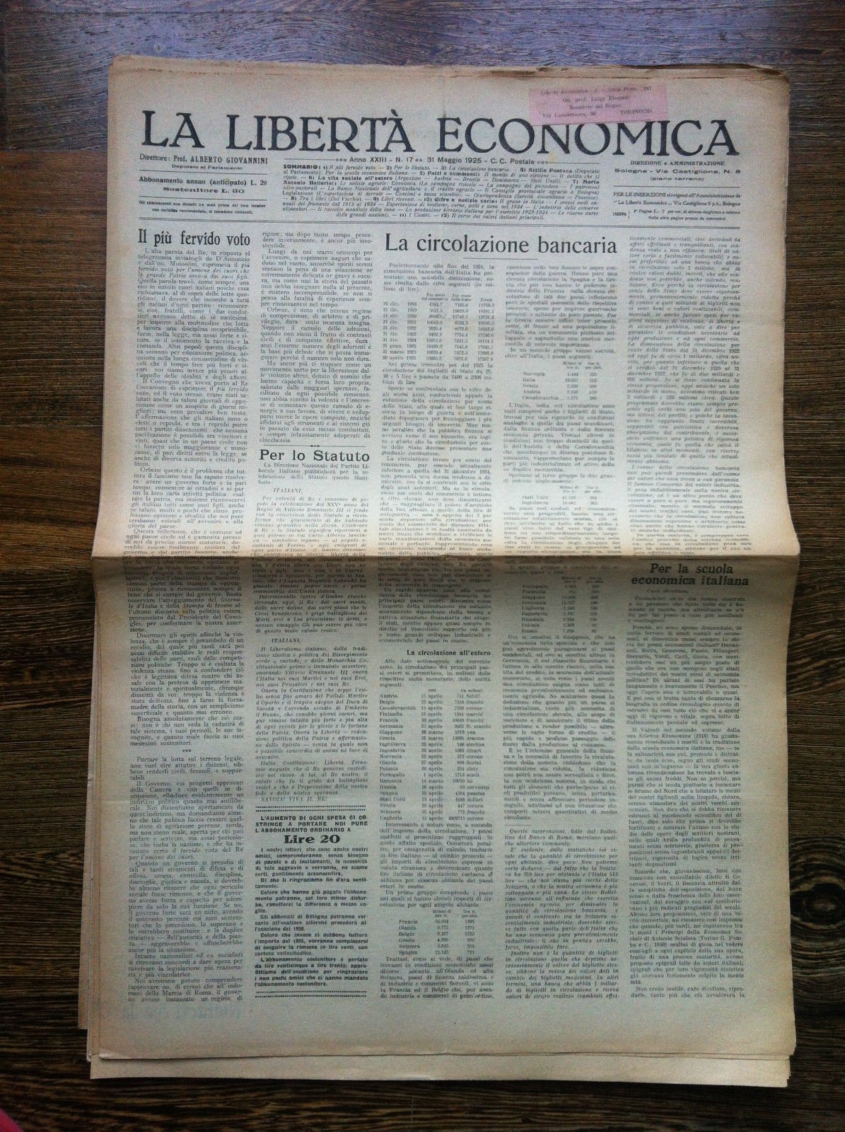 LA LIBERTA' ECONOMICADirettore Prof. Alberto GiovanniniCopia indirizzata in abbonamento al Sig. Prof. Luigi Einaudi Torino Senatore del RegnoIn buono stato (25 g)E11349