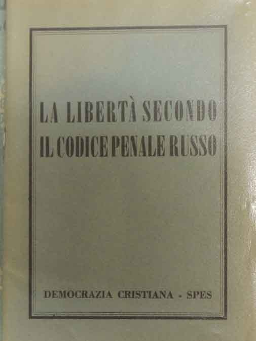 La libertà secondo il codice penale russo, Democrazia Cristiana – Spes, s.l. (ma stampato a Roma, presso l’A.g.i.), s.d. (ma dopo il 1940), pp. 31, cm 17, opuscolo spillato. Minimi segni del tempo, per il resto ben conservato.