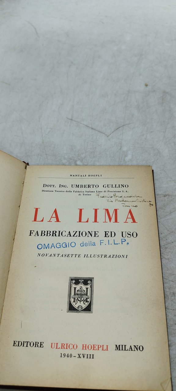 umberto gullino la lima fabbricazione ed uso hoepli. , hoepli 1940 italiano, 226 °
