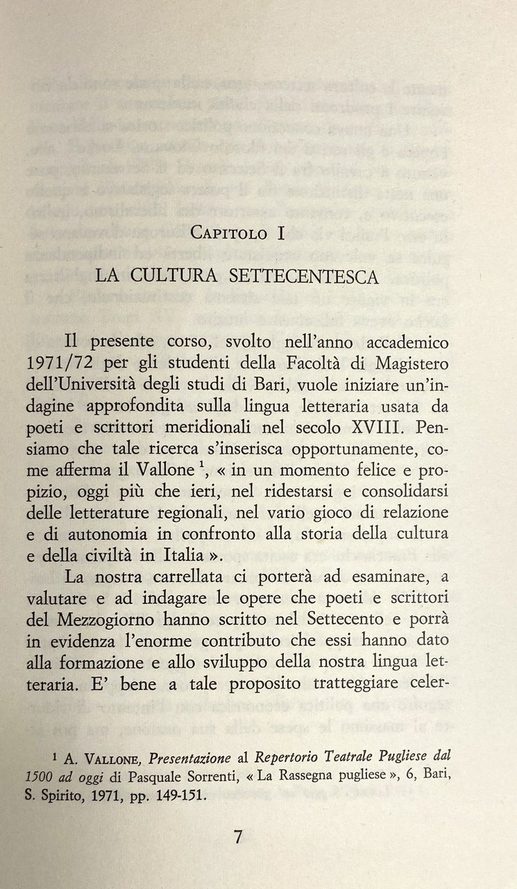 Il presente corso, svolto nell'anno accademico 1971/72 per gli studenti della Facoltà di Magistero dell'Università degli studi di Bari, vuole iniziare un'indagine approfondita sulla lingua letteraria usata da poeti e scrittori meridionali nel secolo XVIII. Pensiamo che tale ricerca s'inserisca opportunamente, come afferma il Vallone, in un momento felice e propizio, oggi più che ieri, nel ridestarsi e consolidarsi delle letterature regionali, nel vario gioco di relazione e di autonomia in confronto alla storia della cultura della civiltà in Italia. La nostra carrellata ci porterà ad esaminare, a valutare e ad indagare le opere che poeti e scrittori del Mezzogiorno hanno scritto nel Settecento e porrà evidenza l'enorme contributo che essi hanno dato formazione e allo sviluppo della nostra lingua letteraria. È bene a tale proposito tratteggiare celermente la cultura settecentesca, nella quale sono da rinvenire i prodromi della civiltà moderna. Una concezione politico-storica si ebbe con l'opera e gli scritti del filosofo Giovanni Locke, e quello vissuto a cavallo fra il Seicento ed il Settecento, una netta distinzione tra il potere legislativo esecutivo e, convinto assertore del liberalismo, indicò in esso l'unica via che i popoli d'Europa dovevano seguire se volevano acquistare libertà ed indipendenza politica. In quel momento, però, solo in Inghilterra vigore un tale sistema costituzionale, che il Locke aveva felicemente intuito.