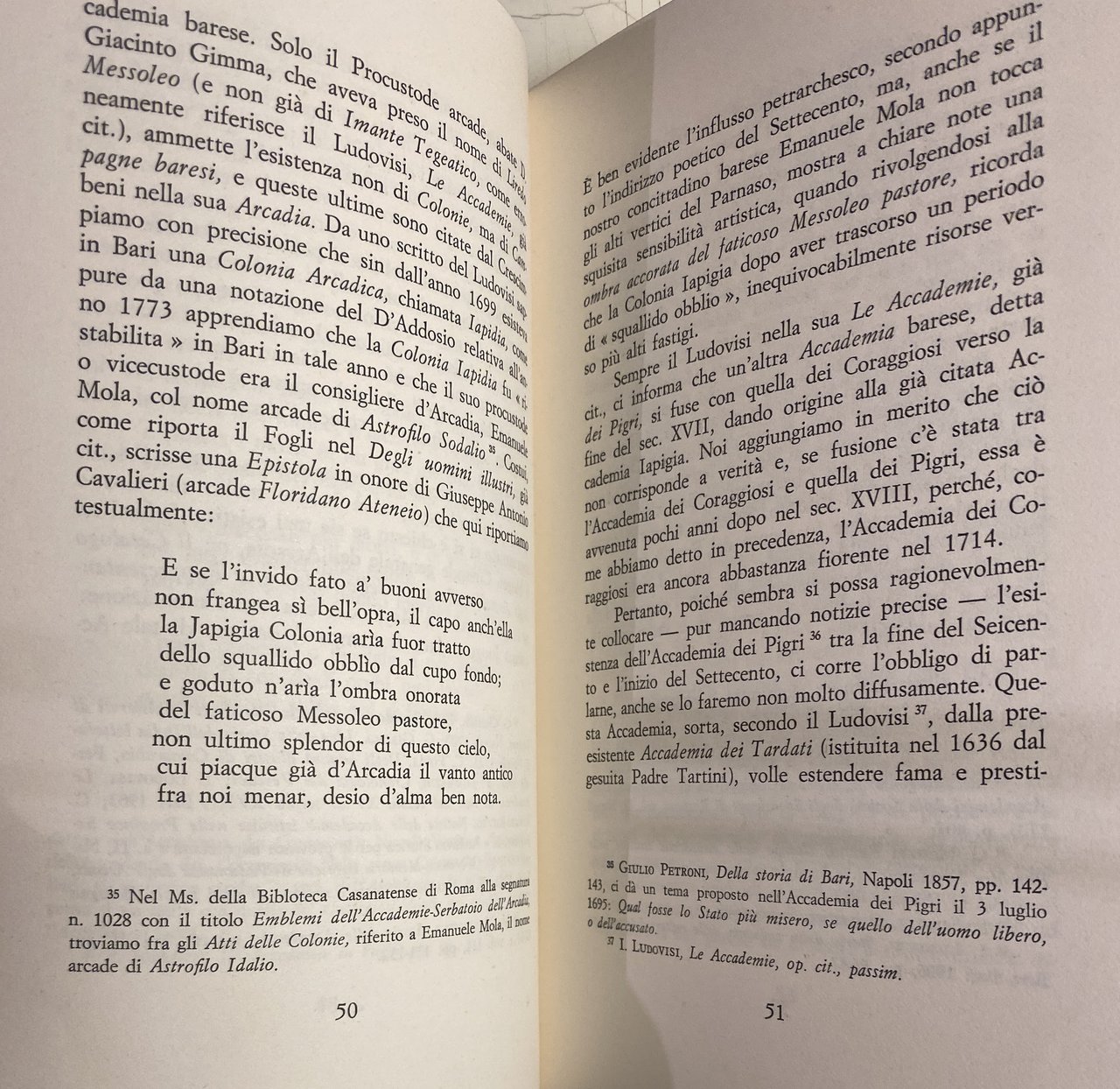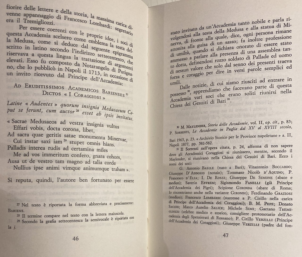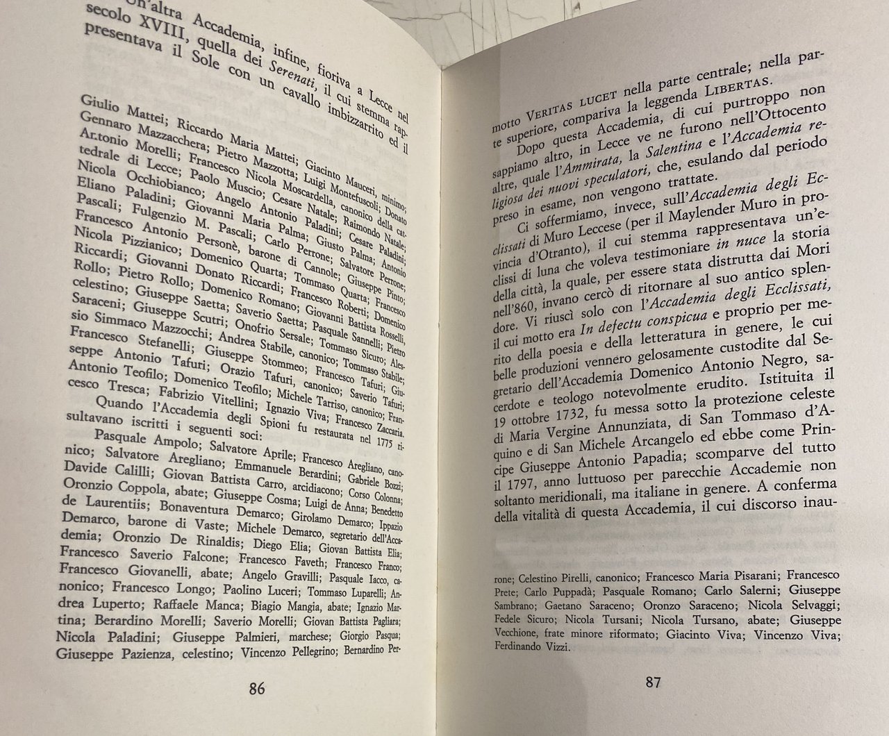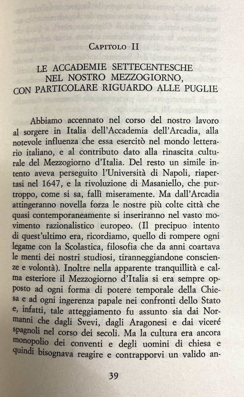 Soggetti: Cultura settecentesca, Settecento, Italianistica, Lingua, Italiano, Critica letteraria, Sud, Accademie letterarie, Scientifiche, Teologico-ecclesiastiche-religiose, Discipline Giuridiche, Mario Petraroli, Puglia, Regno di Napoli, Calabri, Sicilia, Intellettuali, Scrittori, Studi critici, Linguistica, Toscano, Michele Maylender, Storia, Camillo Minieri Riccio, Giuristi, Teologia, Chiesa, Scienze, Eruditi, Prosa, Poesia, Romanzi, Opere generali, Cognomi Pugliesi, Genealogia, Medicina, Gaetano Tremigliozzi, Niccolò Verzilli, Professioni, Mestieri, Università, Circoli culturali, Associazioni, Corporazioni, Iapigia, Iapidia, Arcadia, Pigri, Sacra, Fabrizio Carafa, Vergine Addolorata, Letteratura, Andria, Sinceri Barletta, S. Gaetano, Riunioni, Foggia, Bitonto, Bari, Lecce, Muscettolana, Lucera, Eccitati, Vigo Garganico, Invogliati, Brindisi, Rinnovati, Francavilla Fontana, Affumicati, Mesagne, Taranto, Audati, Arcivescovile, Alessano, Offuscati, Laureati, Arcadia Reale, Galatina, Resoluti, Irresoluti, Attempati, Infiammati, Galatone, Spioni, Speculatori, S. Oronzo, Serenati, Ecclissati, Muro Leccese, Intrepidi, Scorrano, Agitati, Nardò, Infimi, Documenti, Fermento culturale, Illuminismo, Progresso scientifico, Vito A. Melchiorre, Gioacchino Murat, Melchiorre Delfico, Pietro Napoli-Signorelli, Luca De Samuele Cagnazzi, Terra d'Otranto, Gesuiti, Giuseppe Maria Giovene, Grammatica, Lettere, Pietro Giannone, Dialettismi, Filologia, Dialetti regionali, Lezioni, Giulio Alberoni, Locke, Saggio sul governo civile, A. Vallone, Liberalismo inglese, Inghilterra, Austria, Germania, Prussia, Russia, Europa, Francia, Italia, Problemi linguistici, Antonio Profilo, Anselmo C. Leopardi, Newton, Leibniz, Galileo Galilei, Scienziati, Trasformati, Adunanza, Antonio Zanon, Arcadi, Biblioteca Casanatense, Carlo Censori, Città, Codice, Colonia, Compagnia della Calza, Congrega, Dissertazioni, Filosofia, Francesco Garuffi, Impresa, Luigi Marchese, Archivio Storico, Rozzi Savignano di Romagna, Sodalizio, Volsca, Versi, Latino, Censore, Uomini colti, Giovan Battista Gagliardi, Componimenti, Sonetti, Guerra di Successione spagnola, Accademici, Domenico De Angelis, Gustavo Paladini, Fucine, Carafa, Sylos, De Ruggiero, Borbone, Guerra dei sette anni, Dinastie reali, Principe, Vittorio Alfieri, Giuseppe Parini, Bettinelli, Alessandro Verri, Vincenzo Cuoco, Rivoluzione napoletana, Bernando Tanucci, Ferdinando IV, Maria Carolina, Cesare Beccaria, Pasquale Sorrenti, Giuseppe Palmieri, Libertà, Pietro Verri, Antonio Genovesi, Barbagallo, Rivoluzione francese, Monarchia assoluta, Assolutismo, Asburgo, Stampa, Editoria, Crusca, Carlo Denina, Francesco Algarotti, Gasparo Gozzi, Caffè, Nobiltà, Borghesia, Ferdinando Galiani, Gaetano Filangieri, Carlo Gozzi, Moliere, Racine, Corneille, Goldoni, Vincenzo Gioberti, Risorgimento, Melchiorre Cesarotti, Vincenzo Gravina, Metastasio, Cesare Balbo, Mario Puppo, Panettieri, Purezza, Pompeo Giannantonio, Giornali, Riviste, Volgare, Melchiorre Cesarotti, Lodovico Antonio Muratori, Neologismi, Sensismo, Puristi, Domenico Maria Manni, Saverio Bettinelli, Diceria di Aristarco, Giuseppe Baretti, Bembo, Ariosto, Gerolamo Rosacco, Toscana, Pietro Leopoldo, Bruno Migliorini, Giulio Petroni, Giacinto Gimma, Rossano calabro, Memorie storiche, Motti, Poeti, Illuministi, Voltaire, Eighteenth century, Italian studies, Language, Criticism, South, Literary academies, Scientific, Theological-ecclesiastical-religious, Legal disciplines, Kingdom of Naples, Sicily, Intellectuals, Writers, Critical studies, Linguistics, Tuscan, History, Jurists, Theology, Church, Sciences, Erudite, Prose, Poetry, Novels, General works, Apulian surnames, Genealogy, Medicine, Professions, University, Cultural Clubs, Associations, Corporations, Literature, Meetings, Archiepiscopal, Documents, Ferment cultural, Enlightenment, Scientific progress, Jesuits, Grammar, Letters, Dialectics, Philology, Regional dialects, Lessons, Essay on civil government, English liberalism, England, Germany, Europe, France, Italy, Linguistic problems, Scientists, Transformed, Gathering, Library Casanatense, City, Code, Congregation, Dissertations, Philosophy, Enterprise, Historical Archive, Association, Verses, Cultured men, Compositions, Sonnets, War, Spanish Succession, Academics, Forges, Bourbon, Seven Years' War, Royal Dynasties, Prince, Neapolitan Revolution, Ferdinand IV, Freedom, French Revolution, Absolute Monarchy, Absolutism, Habsburg, Press, Publishing, Coffee, Nobility, Bourgeoisie, Bakers, Purity, Newspapers, Magazines, Vulgar, Neologisms, Sensism, Purists, Tuscany, Historical memoirs, Mottos, Poets, Illuminists, Libri rari Vintage fuori catalogo, Bibliografia, Riferimento, Rare Out of Print Books, Bibliography, Reference