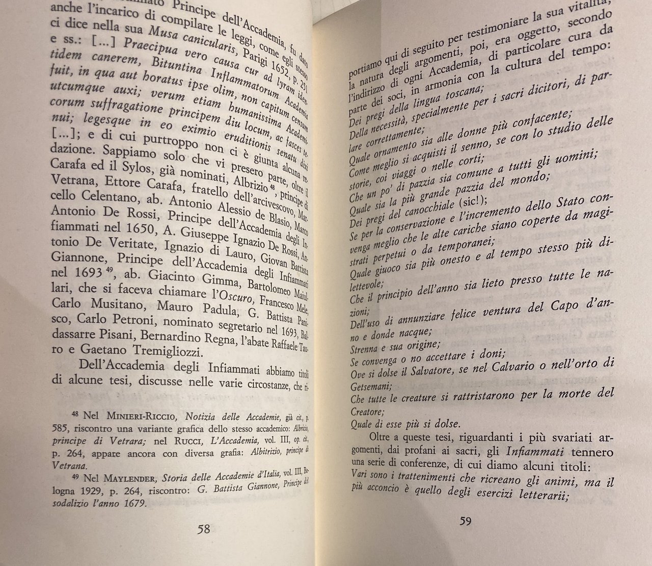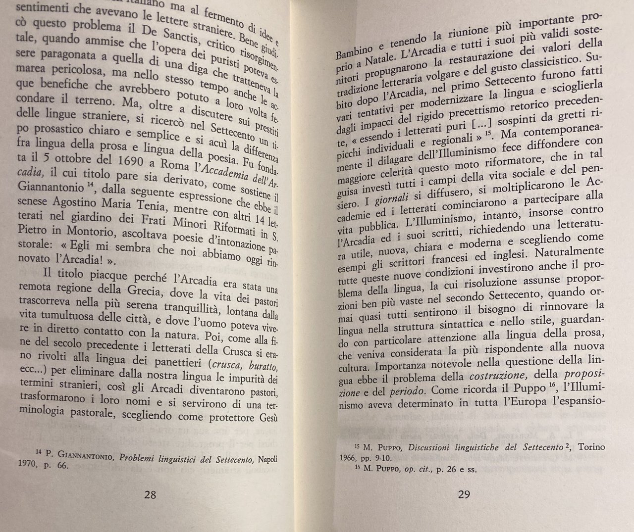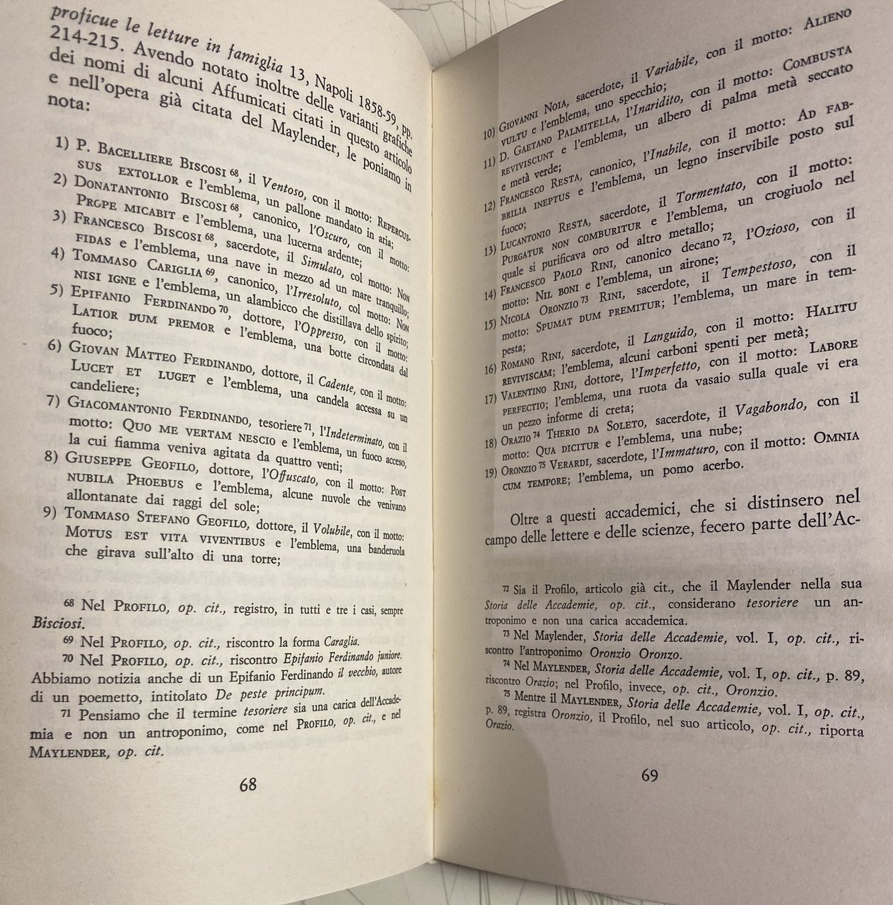 Soggetti: Cultura settecentesca, Settecento, Italianistica, Lingua, Italiano, Critica letteraria, Sud, Accademie letterarie, Scientifiche, Teologico-ecclesiastiche-religiose, Discipline Giuridiche, Mario Petraroli, Puglia, Regno di Napoli, Calabri, Sicilia, Intellettuali, Scrittori, Studi critici, Linguistica, Toscano, Michele Maylender, Storia, Camillo Minieri Riccio, Giuristi, Teologia, Chiesa, Scienze, Eruditi, Prosa, Poesia, Romanzi, Opere generali, Cognomi Pugliesi, Genealogia, Medicina, Gaetano Tremigliozzi, Niccolò Verzilli, Professioni, Mestieri, Università, Circoli culturali, Associazioni, Corporazioni, Iapigia, Iapidia, Arcadia, Pigri, Sacra, Fabrizio Carafa, Vergine Addolorata, Letteratura, Andria, Sinceri Barletta, S. Gaetano, Riunioni, Foggia, Bitonto, Bari, Lecce, Muscettolana, Lucera, Eccitati, Vigo Garganico, Invogliati, Brindisi, Rinnovati, Francavilla Fontana, Affumicati, Mesagne, Taranto, Audati, Arcivescovile, Alessano, Offuscati, Laureati, Arcadia Reale, Galatina, Resoluti, Irresoluti, Attempati, Infiammati, Galatone, Spioni, Speculatori, S. Oronzo, Serenati, Ecclissati, Muro Leccese, Intrepidi, Scorrano, Agitati, Nardò, Infimi, Documenti, Fermento culturale, Illuminismo, Progresso scientifico, Vito A. Melchiorre, Gioacchino Murat, Melchiorre Delfico, Pietro Napoli-Signorelli, Luca De Samuele Cagnazzi, Terra d'Otranto, Gesuiti, Giuseppe Maria Giovene, Grammatica, Lettere, Pietro Giannone, Dialettismi, Filologia, Dialetti regionali, Lezioni, Giulio Alberoni, Locke, Saggio sul governo civile, A. Vallone, Liberalismo inglese, Inghilterra, Austria, Germania, Prussia, Russia, Europa, Francia, Italia, Problemi linguistici, Antonio Profilo, Anselmo C. Leopardi, Newton, Leibniz, Galileo Galilei, Scienziati, Trasformati, Adunanza, Antonio Zanon, Arcadi, Biblioteca Casanatense, Carlo Censori, Città, Codice, Colonia, Compagnia della Calza, Congrega, Dissertazioni, Filosofia, Francesco Garuffi, Impresa, Luigi Marchese, Archivio Storico, Rozzi Savignano di Romagna, Sodalizio, Volsca, Versi, Latino, Censore, Uomini colti, Giovan Battista Gagliardi, Componimenti, Sonetti, Guerra di Successione spagnola, Accademici, Domenico De Angelis, Gustavo Paladini, Fucine, Carafa, Sylos, De Ruggiero, Borbone, Guerra dei sette anni, Dinastie reali, Principe, Vittorio Alfieri, Giuseppe Parini, Bettinelli, Alessandro Verri, Vincenzo Cuoco, Rivoluzione napoletana, Bernando Tanucci, Ferdinando IV, Maria Carolina, Cesare Beccaria, Pasquale Sorrenti, Giuseppe Palmieri, Libertà, Pietro Verri, Antonio Genovesi, Barbagallo, Rivoluzione francese, Monarchia assoluta, Assolutismo, Asburgo, Stampa, Editoria, Crusca, Carlo Denina, Francesco Algarotti, Gasparo Gozzi, Caffè, Nobiltà, Borghesia, Ferdinando Galiani, Gaetano Filangieri, Carlo Gozzi, Moliere, Racine, Corneille, Goldoni, Vincenzo Gioberti, Risorgimento, Melchiorre Cesarotti, Vincenzo Gravina, Metastasio, Cesare Balbo, Mario Puppo, Panettieri, Purezza, Pompeo Giannantonio, Giornali, Riviste, Volgare, Melchiorre Cesarotti, Lodovico Antonio Muratori, Neologismi, Sensismo, Puristi, Domenico Maria Manni, Saverio Bettinelli, Diceria di Aristarco, Giuseppe Baretti, Bembo, Ariosto, Gerolamo Rosacco, Toscana, Pietro Leopoldo, Bruno Migliorini, Giulio Petroni, Giacinto Gimma, Rossano calabro, Memorie storiche, Motti, Poeti, Illuministi, Voltaire, Eighteenth century, Italian studies, Language, Criticism, South, Literary academies, Scientific, Theological-ecclesiastical-religious, Legal disciplines, Kingdom of Naples, Sicily, Intellectuals, Writers, Critical studies, Linguistics, Tuscan, History, Jurists, Theology, Church, Sciences, Erudite, Prose, Poetry, Novels, General works, Apulian surnames, Genealogy, Medicine, Professions, University, Cultural Clubs, Associations, Corporations, Literature, Meetings, Archiepiscopal, Documents, Ferment cultural, Enlightenment, Scientific progress, Jesuits, Grammar, Letters, Dialectics, Philology, Regional dialects, Lessons, Essay on civil government, English liberalism, England, Germany, Europe, France, Italy, Linguistic problems, Scientists, Transformed, Gathering, Library Casanatense, City, Code, Congregation, Dissertations, Philosophy, Enterprise, Historical Archive, Association, Verses, Cultured men, Compositions, Sonnets, War, Spanish Succession, Academics, Forges, Bourbon, Seven Years' War, Royal Dynasties, Prince, Neapolitan Revolution, Ferdinand IV, Freedom, French Revolution, Absolute Monarchy, Absolutism, Habsburg, Press, Publishing, Coffee, Nobility, Bourgeoisie, Bakers, Purity, Newspapers, Magazines, Vulgar, Neologisms, Sensism, Purists, Tuscany, Historical memoirs, Mottos, Poets, Illuminists, Libri rari Vintage fuori catalogo, Bibliografia, Riferimento, Rare Out of Print Books, Bibliography, Reference