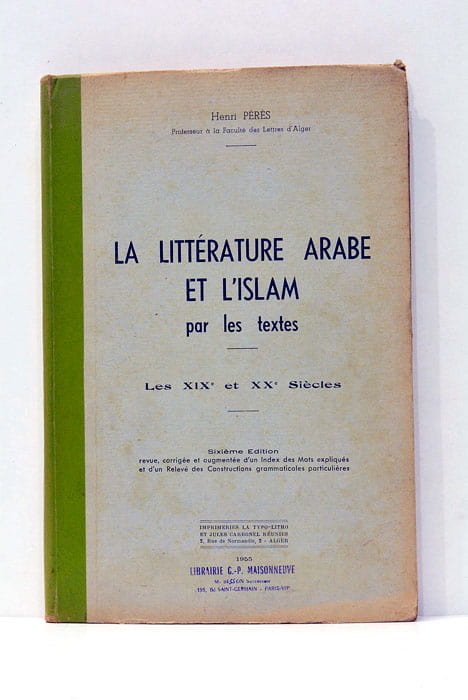273 pages. 4 feuillets. Avant-propos et bibliographie XXVI. (24x16cm). Cartonnage d'éditeur. Couverture brunie avec tache et rousseurs éparses. Coins et coiffes émoussés. Cet ouvrage d'Henri Pérès, publié à Alger en 1955, offre une exploration de la littérature arabe moderne à travers le prisme de l'Islam, en s'appuyant sur des textes significatifs des XIXe et XXe siècles. À une époque où l'Algérie était encore sous influence française, ce livre se positionne comme un pont culturel, mettant en lumière l'évolution des pensées et des écrits arabes dans un contexte de changement et de quête d'identité. L'auteur, reconnu pour son expertise, permet aux lecteurs de comprendre les dynamiques à l'œuvre dans la littérature arabe contemporaine, tout en offrant un aperçu de son adaptation et de sa résilience face aux défis historiques et sociaux. Papier bruni avce petites taches éparses. Sinon bien conservé.