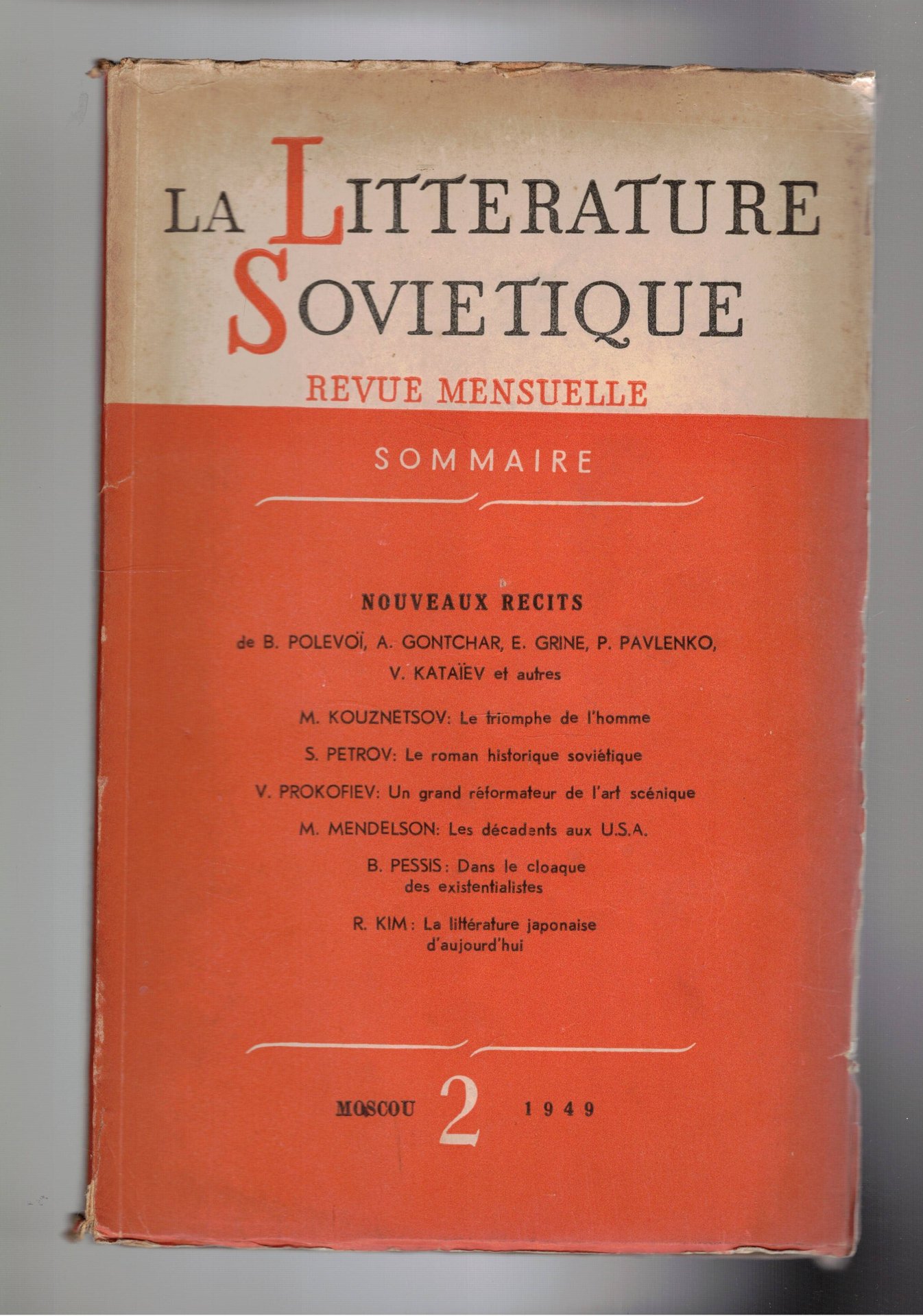 La Litterature Sovietique, revue mensuelle n° 2 1949. Nouveau recits: Kouznetsov M. Le triomphe de l'homme; Petrov S. le roman historique soviètique; Prokofiev V. un grand rèformateur de l'art scènique; Pessis B. dans le cloaque des existetialistes; ecc.
