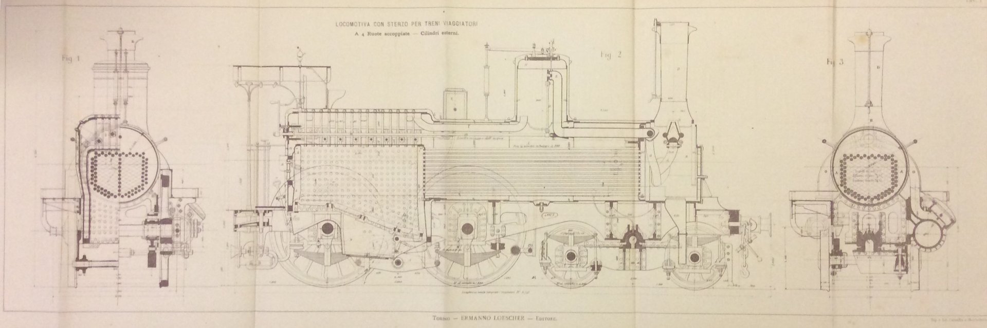In-16 gr. (mm. 185x113), primi 2 volumi (su 3), mz. pelle moderna con ang., pp. XVI,215; VIII,308; con complessive 517 figg. nel testo e 5 belle tavole litografate fuori testo, più volte ripieg., ciascuna con più figg. Seconda edizione. L'opera è così composta: Parte I. - Della caldaia // Parte II. - Meccanismo e carro della locomotiva. Tender. Freni continui - Materiale mobile pel Servizio economico sulle Ferrovie Locomotive per Tramvie. Esemplare ben conservato.
