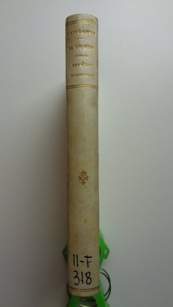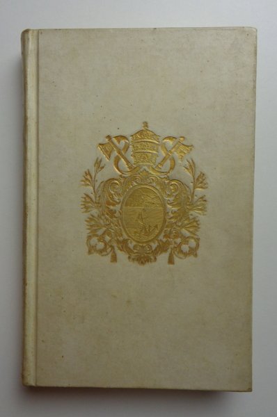 Un volume (12x18 cm) di XIX-175 pagine. Legatura in piena pergamena rigida bianca, ai piatto lo stemma dorato di PIO X; dorso liscio con titolo dorato; risguardie con carta marmorizzata; tagli dorati. Timbro alla pagina di titolo di istituzione ecclesiastica dismessa; un numero in coda al dorso. Libro dalla curiosa storia: dopo la pubblicazione (l'Autore era già morto, come si legge nella Préface) il volume sembra sparire dalla circolazione; unica nota l'invio a Civiltà Cattolica, vol 61, ma con paginazione errata. Una specie di libro fantasma, alle armi di papa Sarto.