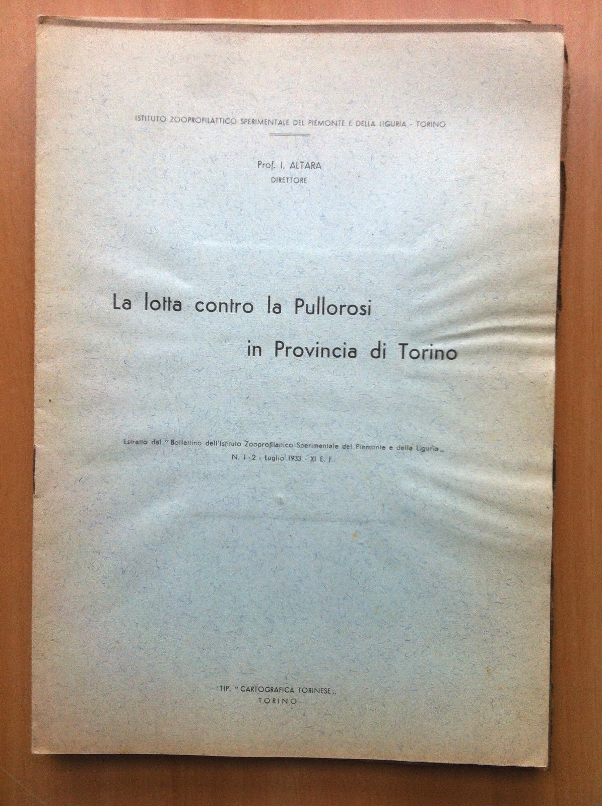 LA LOTTA CONTRO LA PULOROSI IN PROVINCIA DI TORINOProf. I. AltaraIstituto Zooprofilattoco Sperimentale del Piemonte e della LiguriaEstratto dal Bollettino dell'Istituto Zooprofilattico sperimentale del Piemonte e della Luguria n^ 1-2 Luglio 1933Ex libris del Conte di Val Cismon8 pagine - formato 17x24 cm in ottimo stato (25 g)E14583
