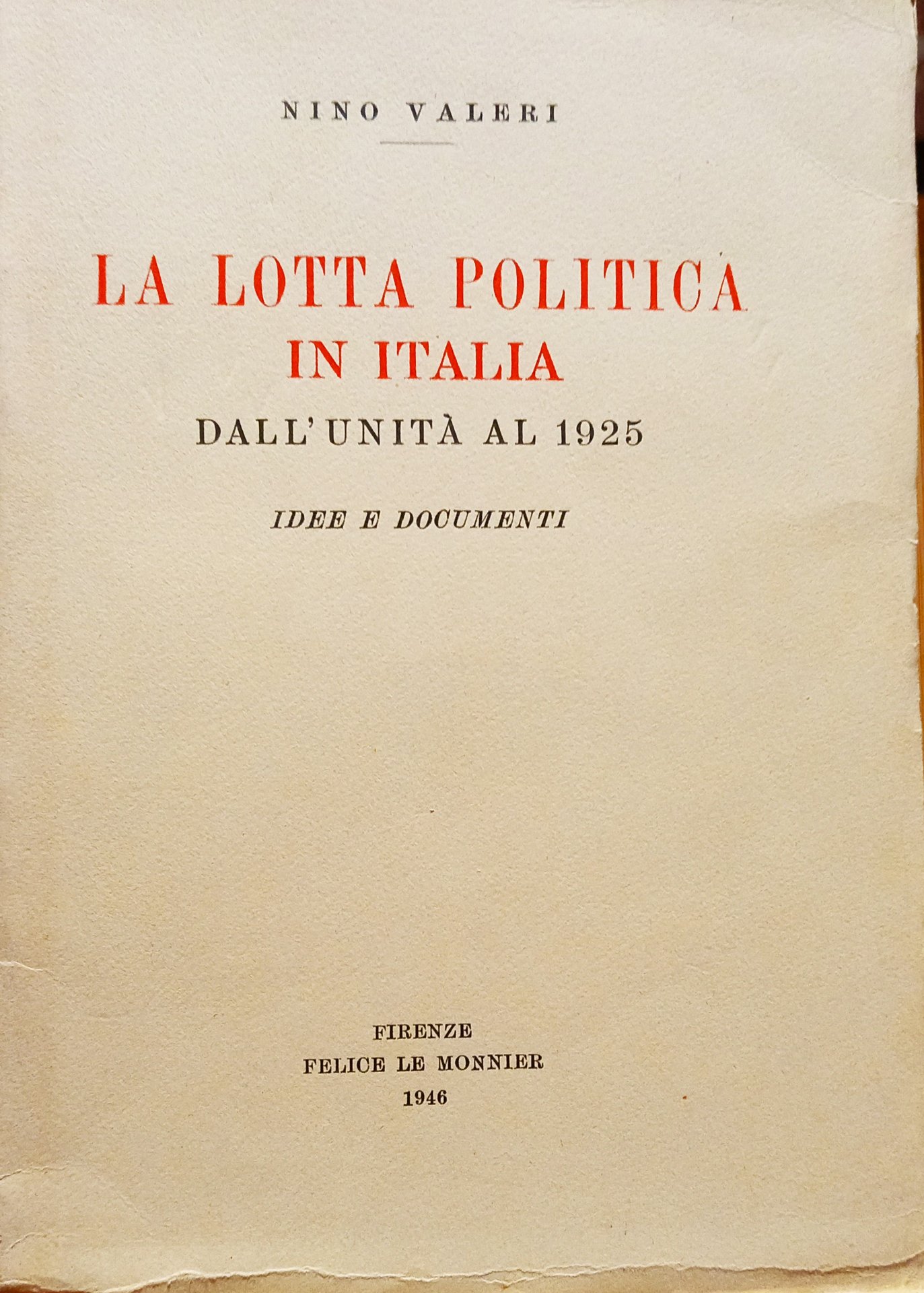 I ed. della raccolta (N. 1332). Il libro è stato stampato nel 1945 ed è uscito - probabilmente - nel 1946: la data 1945 compare in frontespizio e al fondo del volume con la precisazione "3 dicembre", in copertina compare la data 1946. Indice: Prefazione - Il compimento dell'Unità - La questione meridionale - Il movimento per le autonomie regionali - Chiesa e Stato - Destra e Sinistra - Il trasformismo - > e > - Il fenomeno Crispi - L'avvento del socialismo - La sconfitta della reazione (1897-1900) - Giolitti - La guerra lirica e il nazionalismo - La corrente antigiolittiana - Interventisti e neutralisti - Il dopoguerra - I socialisti al bivio - I popolari - Le speranze. In-8, pp. VIII+612, bross. Stato buono (copertina leggermente consunta ai margini con qualche piccolo strappo - pagine ingiallite)