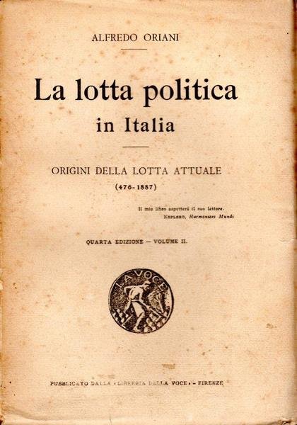 La lotta politica in Italia. Origini della lotta attuale (476-1887), Vol I - II e III, quarta edizione 1917, pp. 374, formato 14 x 20.<BR>Copertina morbida di colore beige con titoli in nero al piatto anteriore e sul dorso. <BR>Lievi fioriture ai piatti. Dorso brunito. Nel complesso buone condizioni.
