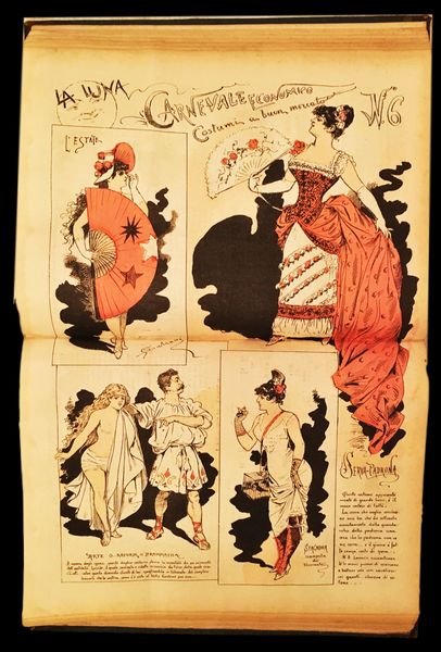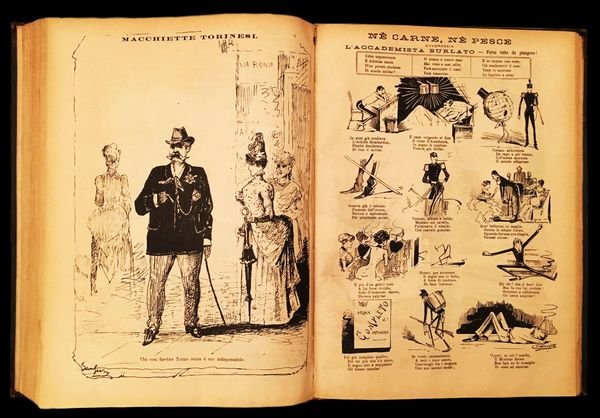 In 4° (33,4×24 cm); due annate rilegate in un volume: 1884, 52 numeri annata completa; 1885, 53 numeri, annata completa. Allinizio del volume è stata conservata la pagina dapertura con la celebre immagine della Luna e della donna appesa con una corda ad essa ed alla scritta La Luna. Due annate per un totale di 105 numeri, ogni numero composto da 8 pagine per un totale di 841 pagine. Legatura coeva in mezza pelle con dorso a sei nervi e titolo, annata, iniziali dellantico proprietario e fregi impressi in oro ai tasselli. Allinterno i numeri del giornale si presentano in ottime condizioni di conservazione. Rarissima raccolta di uno dei più rari giornali satirici dellottocento, celebre e ricercato anche per la sua pagina enigmistica ricca di rebus, sciarade, logogrifi e giochi diversi. Ogni numero presenta almeno una pagina a colori, tantissimi numeri hanno grandi e divertentissime pagine centrali umoristiche con scene illustrate a piena pagina. Il giornale venne fondato a Torino nel 1881 dal noto artista, disegnatore e caricaturista piemontese, Giorgio Ansaldi (1844-1922) che fu uno dei più importanti illustratori italiani del periodo della Belle Epoque. Il suo stile inconfondibile di Ansaldi, che firmava le sue tavole con lo pseudonimo di Dalsani, era particolarmente attento a rappresentare il mondo dei salotti, la vita quotidiana, gli incontri pubblici, la politica, la moda e le abitudini del tempo dei quali Ansaldi era testimone diretto, tutto distorto attraverso la sua vena satirica ed irriverente. Nonostante al giornale collaborassero vari autori, Ansaldi ne fu sempre lanima, ideando numerose delle copertine, delle pagine interne, presentando anche anagrammi, rebus e proposte enigmistiche delle quali Dalsani era un indubbio maestro. Molte delle scene della rivista facevano scandalo per le situazione al limite dellerotico (per i canoni dellepoca) rappresentati donne e ballerine in abiti succinti od in situazioni equivoche. Due annate rarissime da reperirsi complete e ancor più rare in queste ottime condizioni di conservazione.