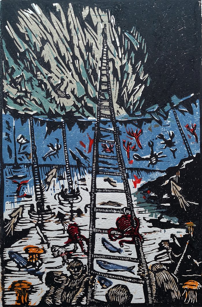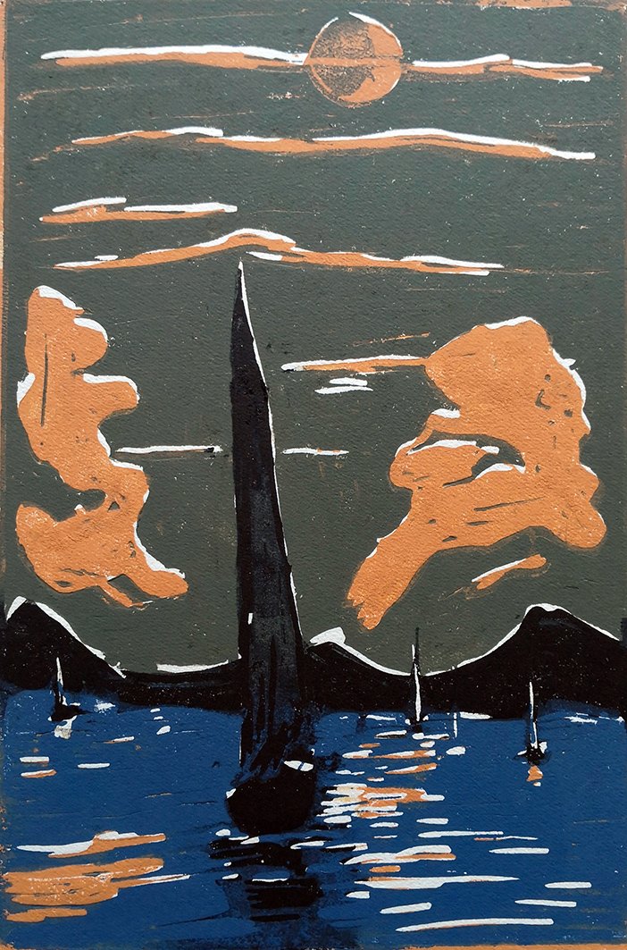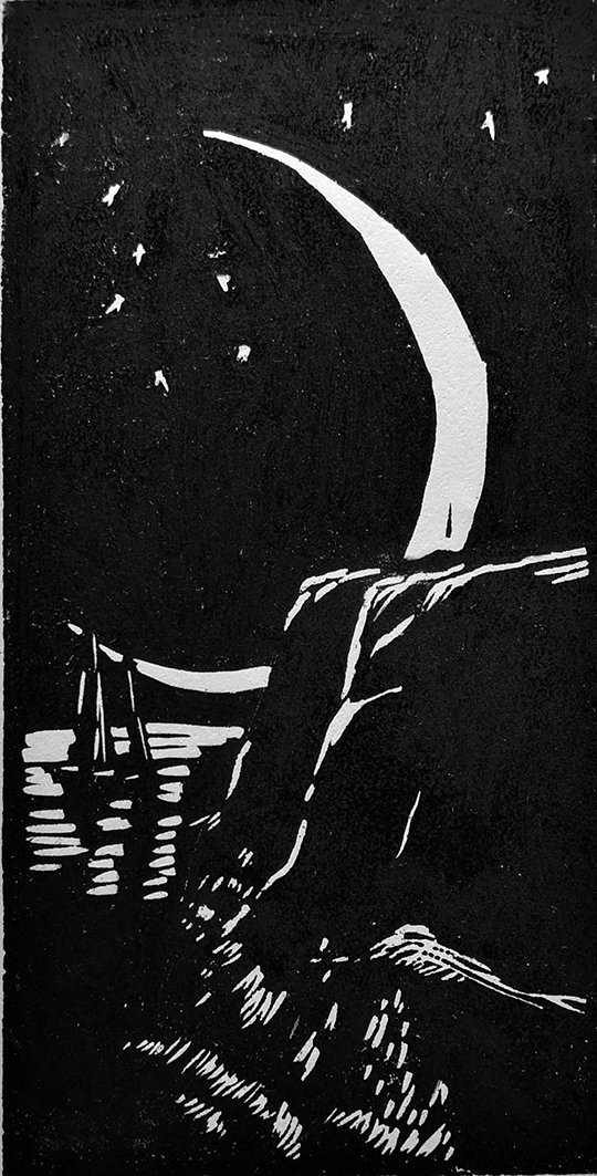 In folio; pp. 7 su carta a mano pesante incise a linoleum al solo recto con il testo e 3 linoleum f.testo a colori; altri 4 linoleum in nero nel testo e come finalini. Brochure edit. con titoli ed illustraz. a linoleum al piatto, sciolto il linoleum "La luna crescente" numerato e firmato a matita dall'artista. Bella edizione, completamente composta a mano dall'autore che ha curato artigianalmente anche la legatura dell'opera; la tiratura è limitata a soli 5 esemplari con le tavole a colori, oltre a una copia f.commercio ed una copia in nero. Numerazione e firma dell'artista al colophon.<BR>(vedi riproduz.)