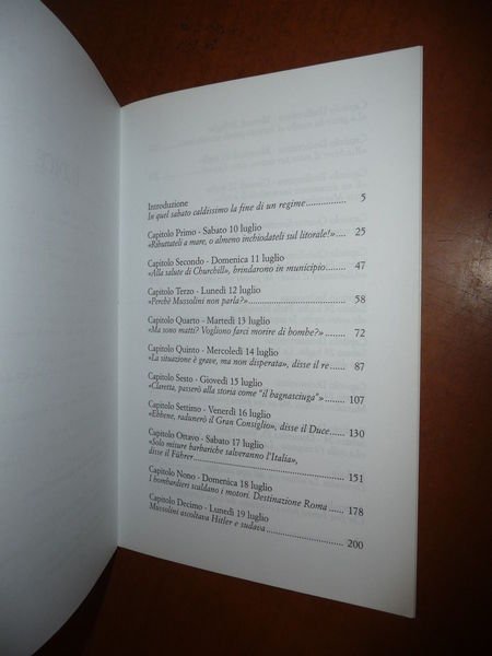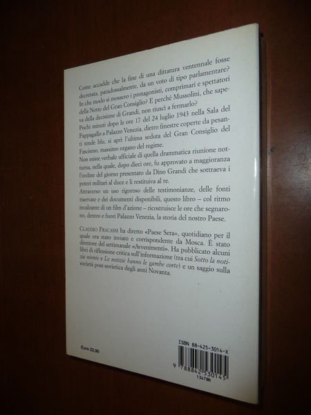 DESCRIZIONE: Ed. Mursia, Milano, 2002, in 8°, br. ed. ill. b/n, pp. 489 Un libro scritto come un film, che si legge d'un fiato come un romanzo giallo (anche se, in questo caso, sappiamo già come va a finire). L'azione è concentrata in due settimane, due settimane cruciali per la storia d'Italia, vale a dire dallo sbarco degli Alleati in Sicilia (10 luglio 1943) alla riunione del Gran Consiglio del Fascismo del 24 luglio. I protagonisti principali di questo dramma sono Mussolini e Grandi, con sullo sfondo il popolo italiano, per il quale doveva cominciare un altro dramma, quello dell'occupazione nazista. Rispetto al Duce, Grandi dimostra di avere capito in anticipo che la parabola del regime fascista era arrivata al capolinea. Un libro da leggere per chi voglia conoscere una pagina fondamentale della nostra storia. Indice completo in foto. CONDIZIONI: Perfette. Qualche leggera piega al dorso. PESO / WEIGHT: 930 gr. without package