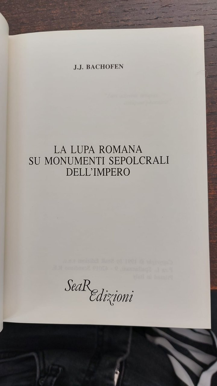 La lupa romana su monumenti sepolcrali dell'Impero - J.J. Bachofen. "MNEMOSYNE" La tradizione Classica e la sua attualità: fonti, testi e saggi critici. Collana diretta da Renato Del Ponte. SeaR edizioni, 1991. pp. 90 + tavole in bianco e nero.