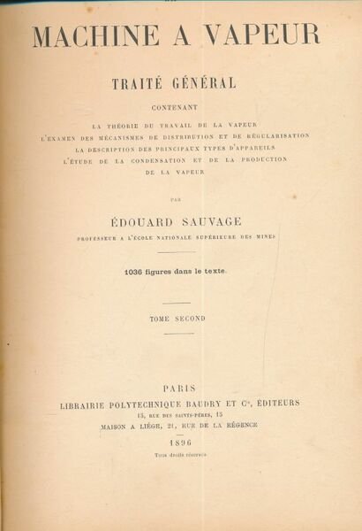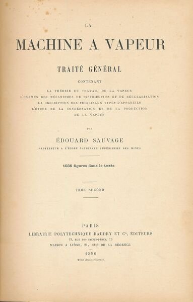Librairie Polytechnique Baudry 1896 Paris, Librairie Polytechnique Baudry et Cie, 1896. 2 volumes in-4 reliés pleine toile prune éditeur .Titre doré sur le plat et le dos. XLV + 468 + XI + 543 pages. 1036 figures dans le texte. L'examen des mécanisme de distribution et de régularisation, la description des principaux types d'appareils. L'étude de la condensation et de la production de la vapeur. Edition originale. Frottement au dos du tome II. Très bon exemplaire.