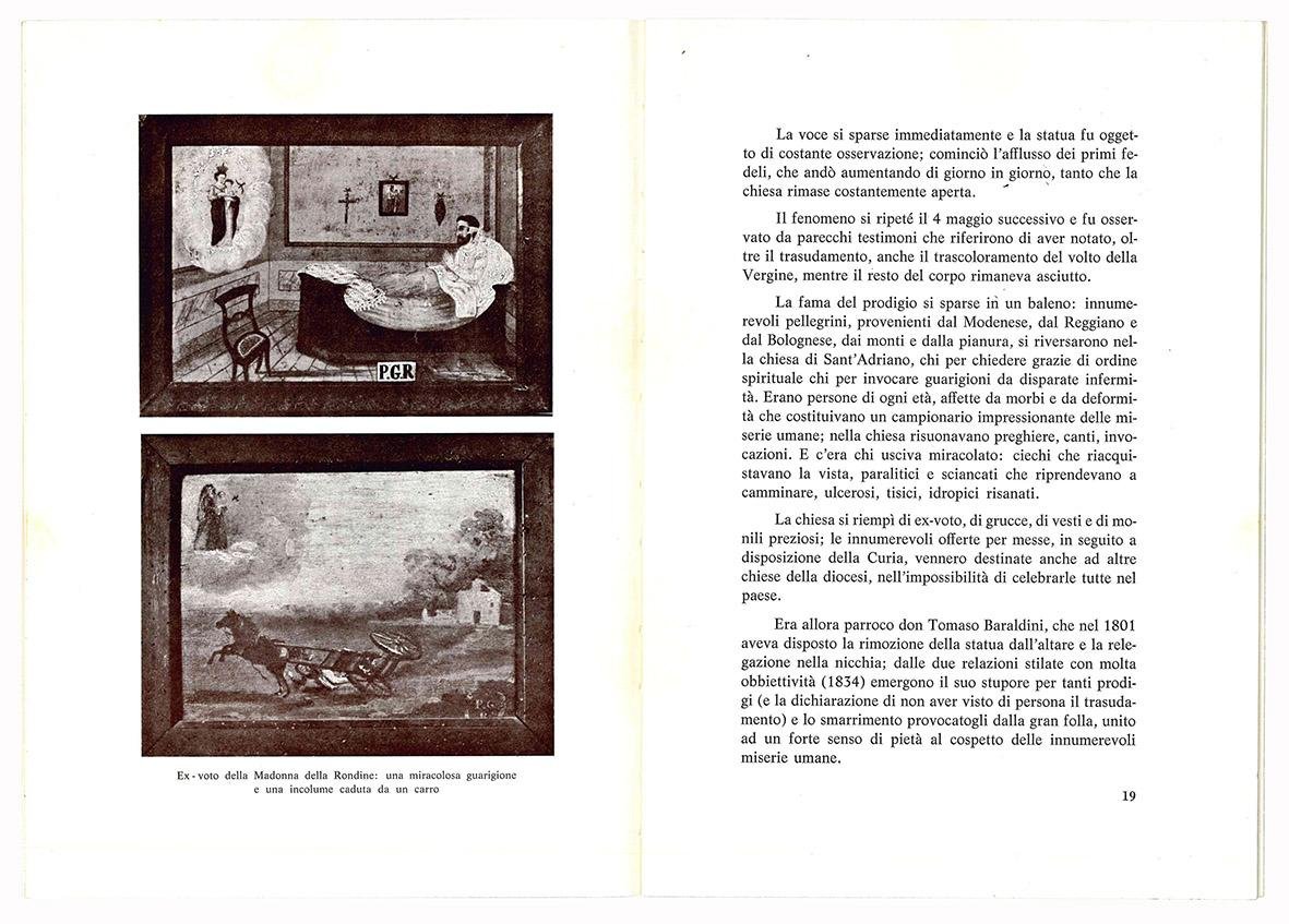 In 8vo (mm 240x170); pp. 31, [3]. Brossura editoriale con copertina illustrata a colori. Monografia dedicata alla storia della celebre statua della Madonna della Rondine di Spilamberto in provincia di Modena.