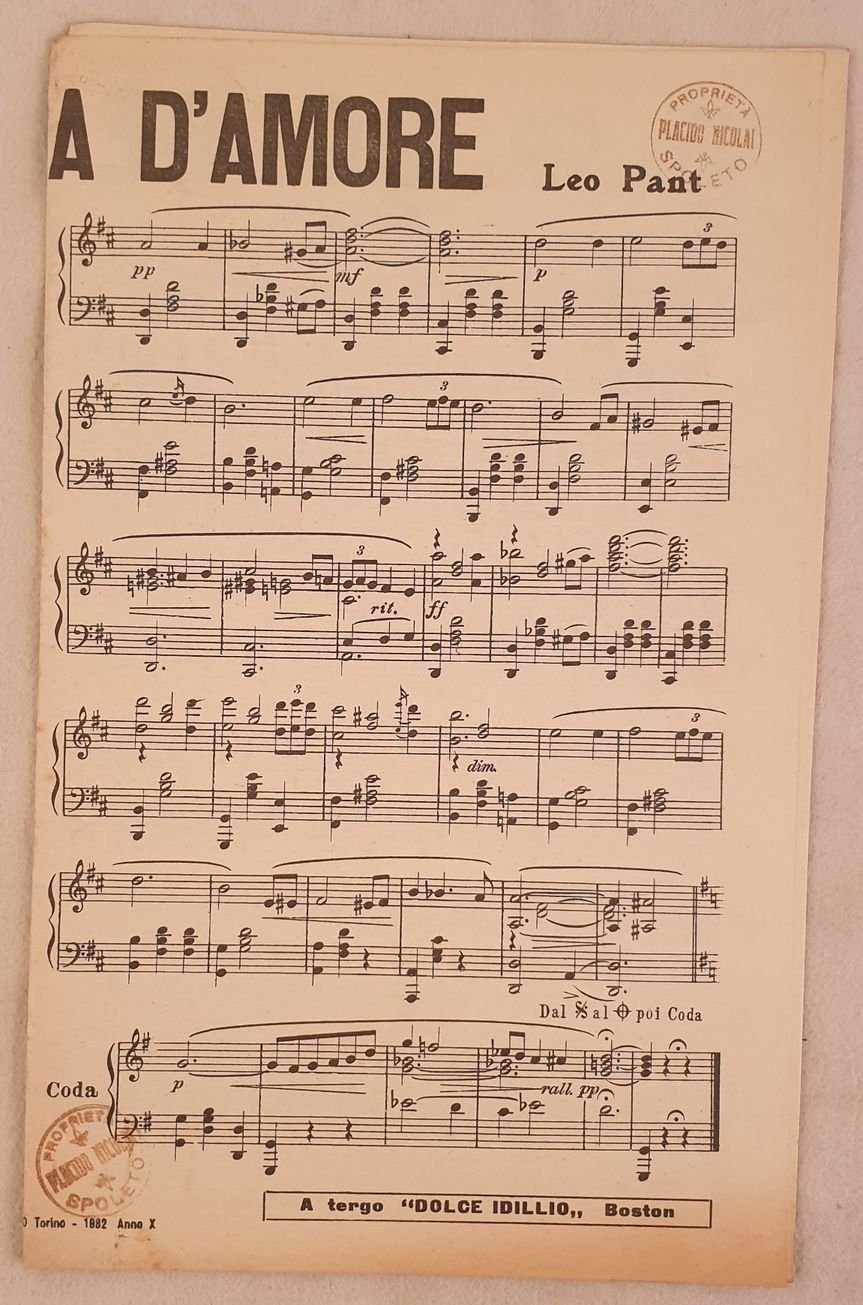 Bello spartito, partitura completa per orchestra del 1932 di due canzoni di Leo Pant e Martinasso.<BR>Copertina mancante. Ex libris in qualche pagina GENERE: Valzer, Bosto STRUMENTI: pianoforte violini violoncello sassofono tromba trombone clarinetto/clarino flauto contrabasso batteria ANNO: 1932 NOTE: In 8. cm 27,5x17. pp. 26. Ottime condizioniBeautiful score of two songs a complete score for orchestra of 1932 by Leo Pant and Martinasso. <BR>Cover is missing. Ex libris in some pages MUSIC: Valzer, Boston INSTRUMENTS: piano violins violoncello saxophone trumpet trombone clarinet/clarion flute contrabbass drums YEAR: 1932 NOTES: In 8. cm 27,5x17. pp. 26. In very good conditions.