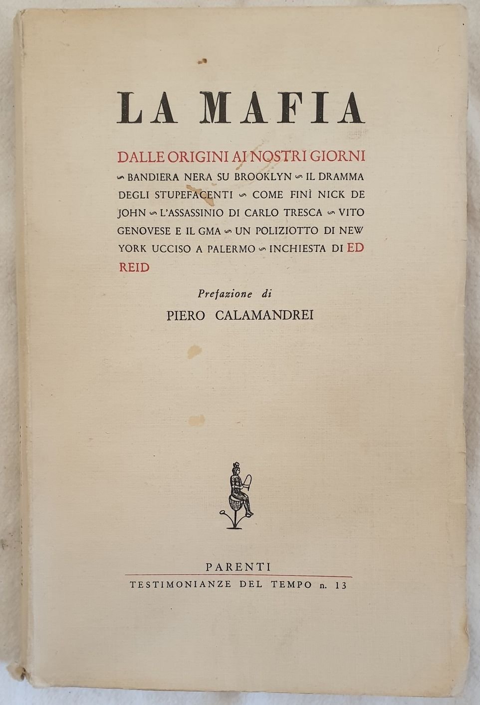 Edizione del 1956 di questa opera sulla mafia di Ed Reid. Prefazione di Piero Calamandrei. All'interno: origine della mafia, Willie disse loro, Omerta, Bandiera nera su Brooklyn, La mafia scelta, la mafia e i narcotici, Nick de John, Li'l Augie, Assassinio di Carlo Tresca, Vito genovese e il GMA, Un memoriale di Kansas City, L'"incidente " di New Orleans, Un poliziotto di New York ucciso a Palermo, vendetta ecc. In ottime condizioni. Copertina editoriale in ottime condizioni generali con lievi usure ai margini e dorso. Legatura in buone condizioni. All'interno le pagine si presentano in ottime condizioni con rare fioriture. Intonso. In 8. Dim. 21x13,5 cm. Pp. XII+256+(4) Peso Kg. 0,276. Edition of 1956 of this work about mafia by Ed Reid. Prefation by Piero Calamandrei. In very good conditions. Editorial cover in very good general conditions lightly worn in the extremities. Binding in good conditions. Inside pages are in very good conditions with occasional foxing. In 8. Dim. 21x13,5 cm. Pp. XII+256+(4) Peso Kg. 0,276