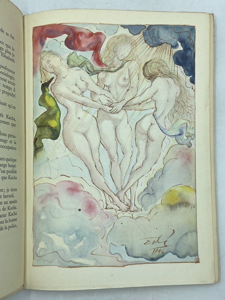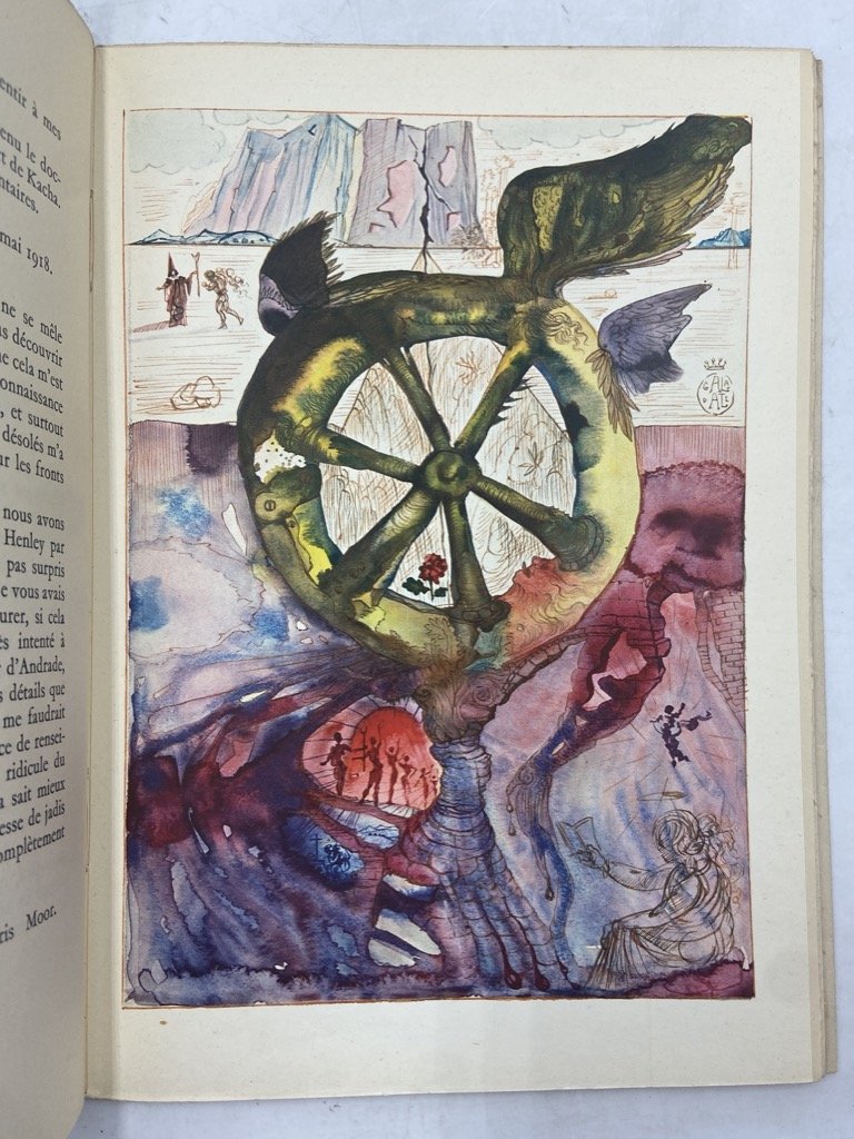 Brossura editoriale a stampa con risvolti, cm 26 x 19, pp 116 (12), 7 tavole a colori da acquerelli di Salvador Dalì. Buono stato di conservazione, con ordinaria brunitura delle carte e lievi segni del tempo: lieve sgualcitura del piatto anteriore, legatura leggermente allentata, un minimo strappo sul solo margine di una tavola (8mm). Prima edizione nell’originale francese di questo romanzo composto a Roma nel 1940 e apparso in traduzione tedesca nel 1948. Stampato nell’ottobre 1949 dai torchi dell’Imprimerie Union di Parigi in una tiratura di 2500 esemplari numerati, il volume è ornato da 7 tavole a colori di Salvador Dalì, disegnate nel 1946. Di famiglia benestante, chimico per formazione, Sandoz fu viaggiatore cosmopolita, compositore e collezionista d’arte, orologi e automi; scrittore tra i maggiori della letteratura fantastica svizzera partecipò al movimento surrealista e fu vicino a Dalì che illustrò numerose delle sue opere, nelle quali è frequente, come in questo romanzo, il tema della casa stregata.