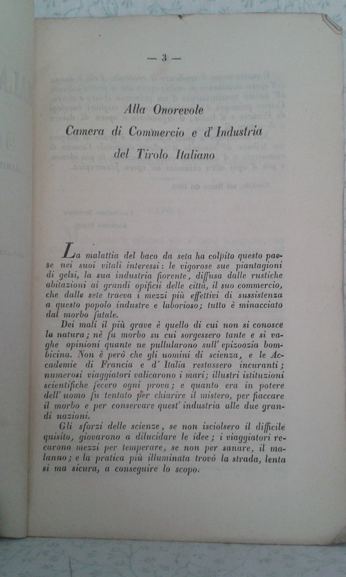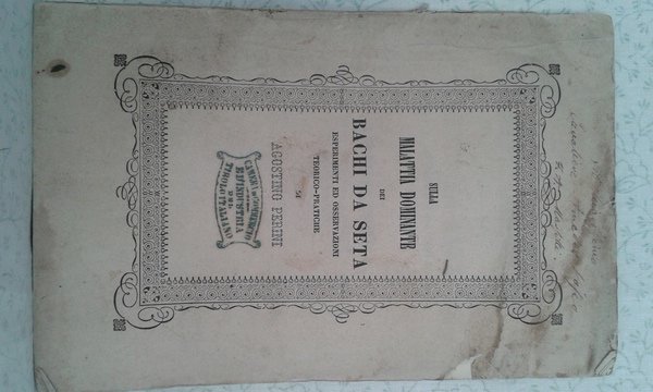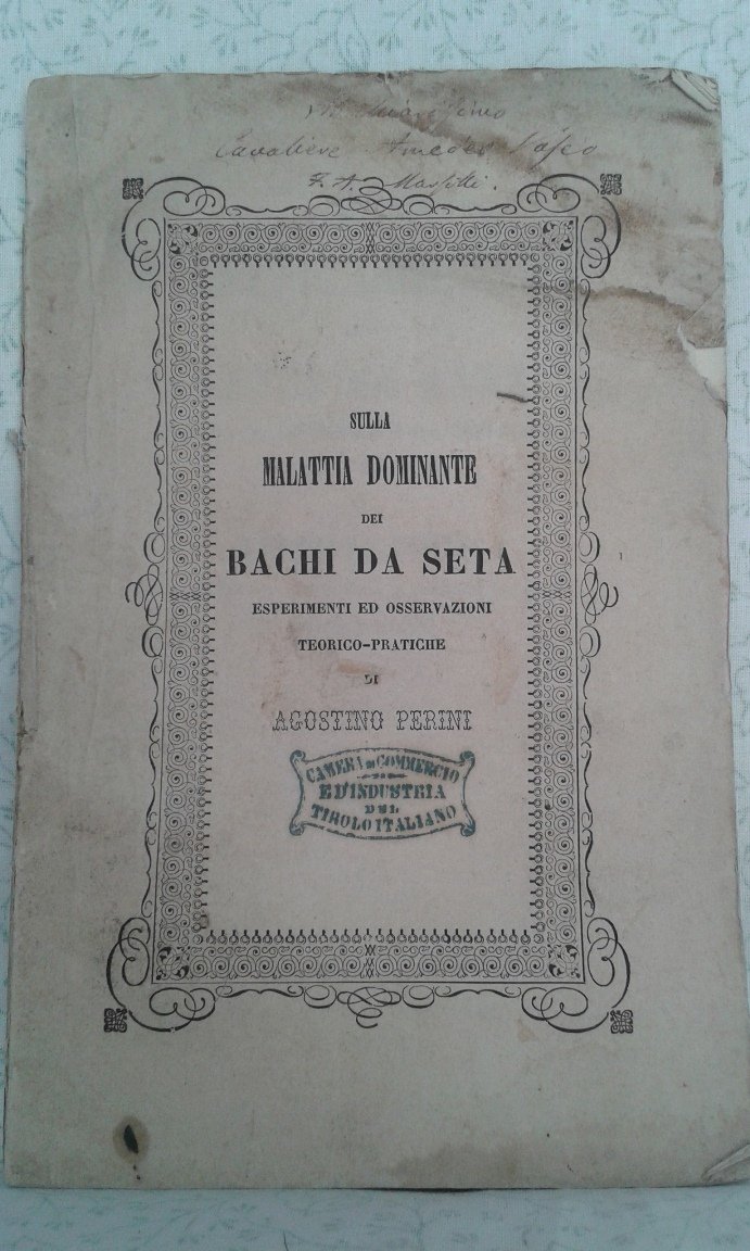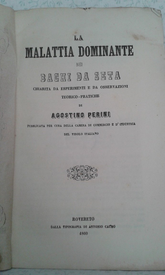 Fascicolo in 8, brossura editoriale, titolo al piatto in cornice silografica, frontespizio, 71 pp., bianca finale. Interessante studio di questo botanico trentino, esperto in agronomia e sericoltura, sul morbo devastante l'allevamento del baco, l'epizoozia bombicina. Importantissimo asse dell'economia della pianura padana e non solo, l'allevamento dei bachi da bozzolo stato essenziale per la formazione delle prime industrie opifici. Antichissima e molto stimata, la produzione italiana raggiunge il culmine nella seconda parte dell'800, creando ricchezza e benessere. Molte energie erano profuse per migliorare quanto possibile i metodi d'allevamento. Importante e rara edizione originale, in bello stato con solo lievi mende alla brossura.