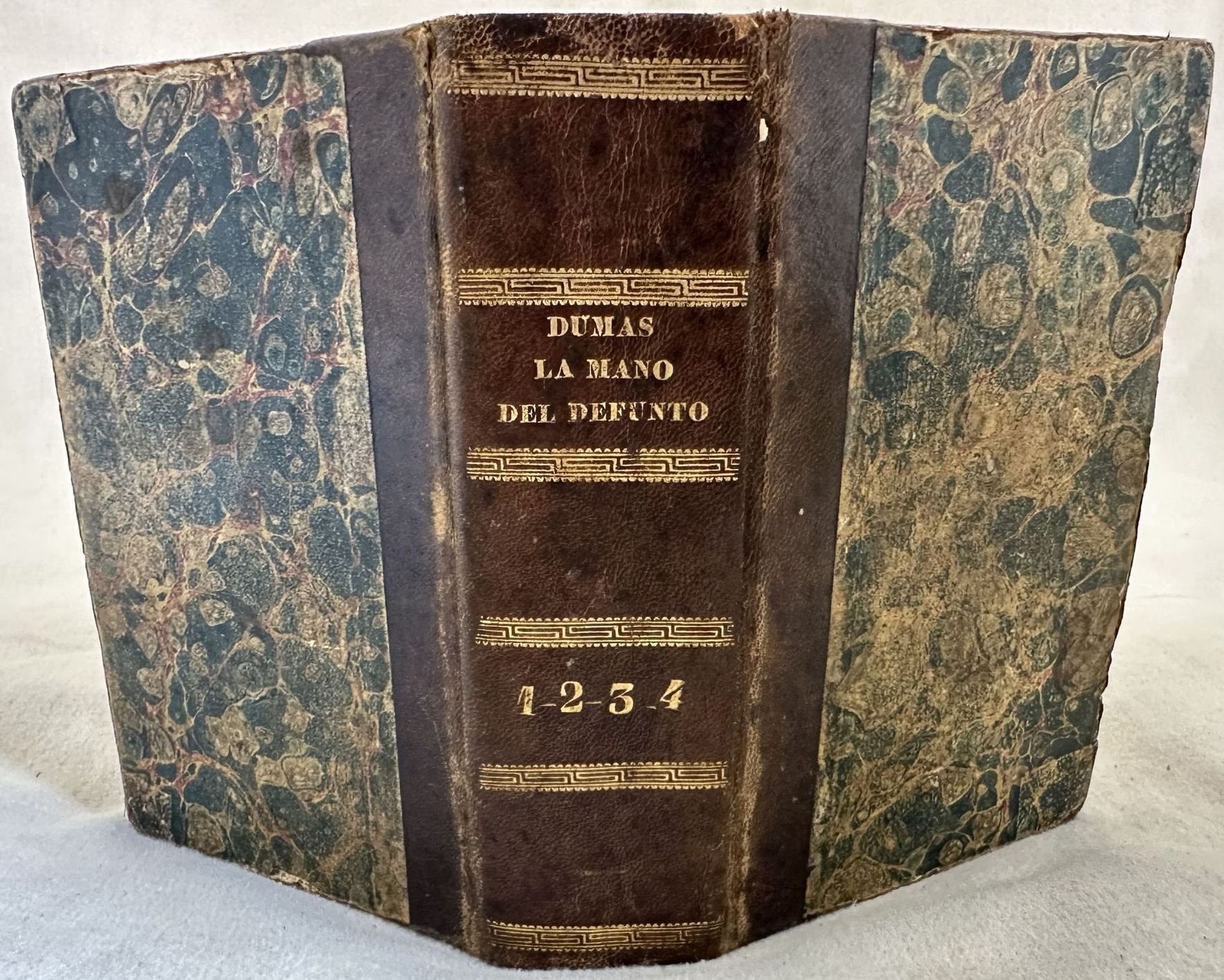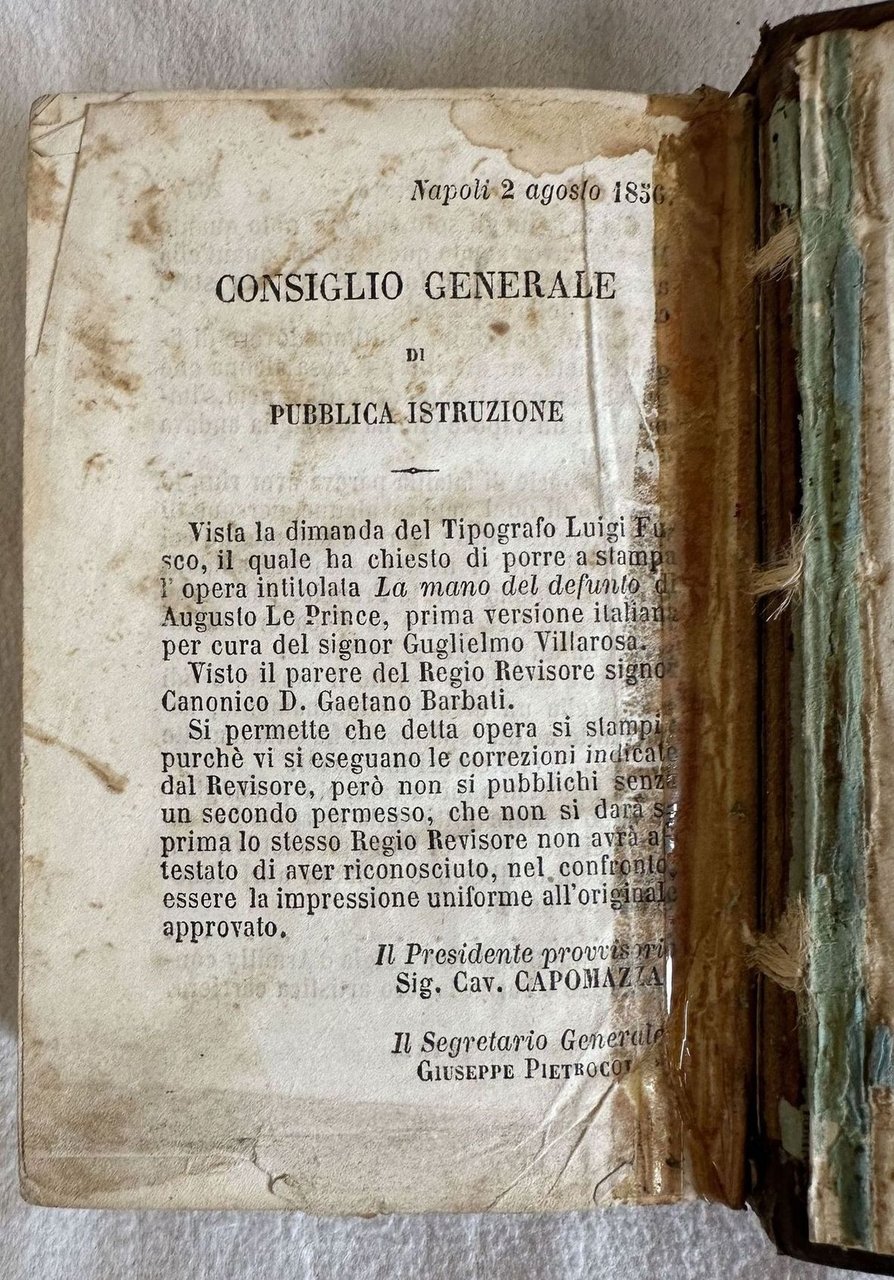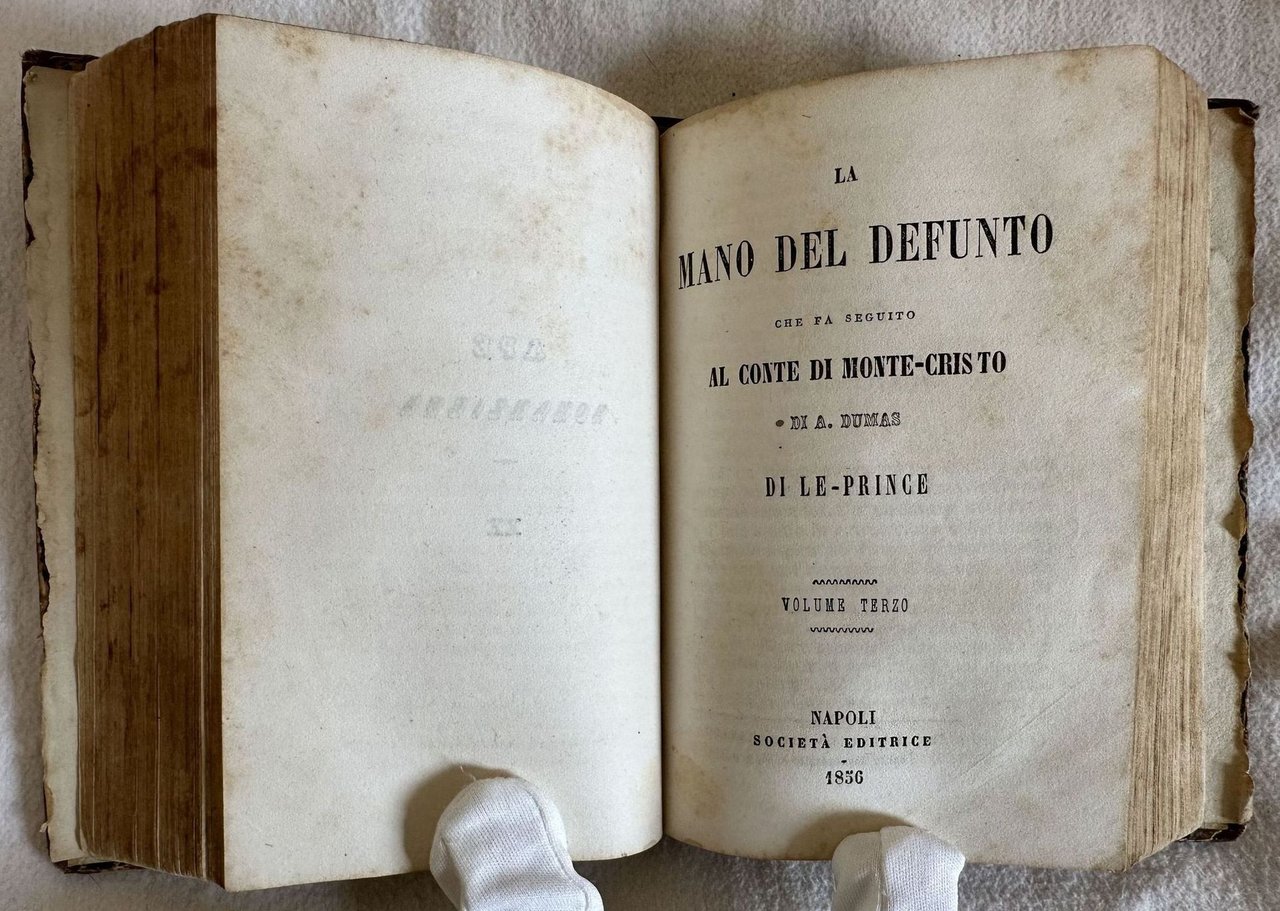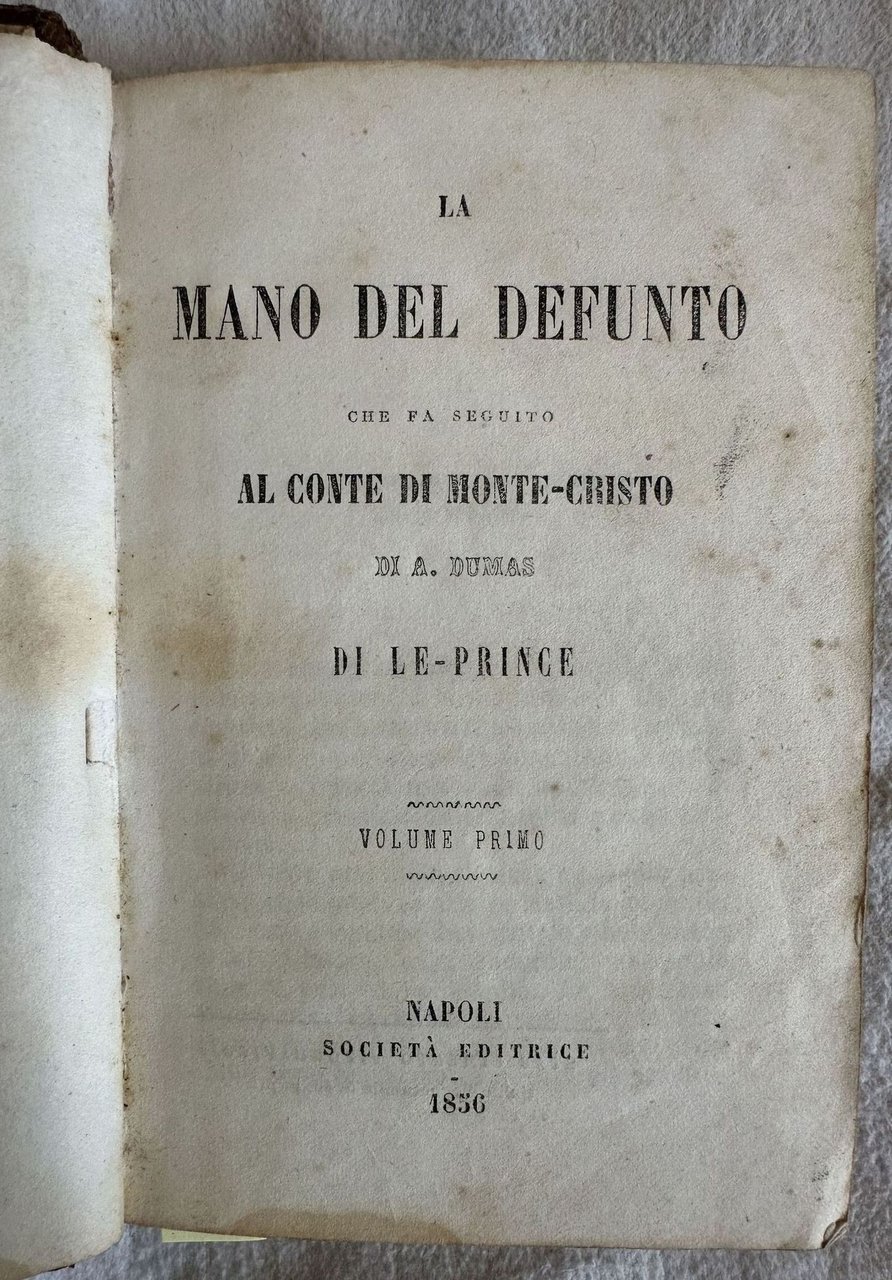 Prima edizione itliana del 1856 di questo romanzo dello scrittore portoghese Alfredo Hogan (1830-1865) presentato come "Seguito del Conte di Monte Cristo". Nella versione italiana dell'opera Hogan utilizzava lo pseudonimo di F. Le Prince o A. Le Prince (Cfr. Opac SBN). L'opera è composta da quattro tomi legati insieme ed è completa. In buone condizioni. Copertina in mezza pelle coeva con titolo e decorazioni in oro al dorso in buone condizioni generali con lievi usure ai margini e dorso. Legatura in buone condizioni. Pagine in buone condizioni con rare fioriture. Ultima pagina staccata ma incollata con nastro adesivo. Segni di colla a pag. 206. Rottura alla prima pagina. In 16. Dim. 14,5x10 cm. Pp. 176+198+(2)+195+(1)+207+(1).First italian edition of 1856 of this novel by the Portugal writer Alfredo Hogan (1830-1865) introduced as "Seguito del Conte di Monte Cristo". In the italian version of the work Hogan used the pseudonymous of F. Le Prince or A. Le Prince (Cfr. Opac SBN). The work is amde up of four tomes bound together and it is complete. In good conditions. Half leather coeval cover with gilted title and decorations in the spine in good general conditions lightly worn in the extremities. Binding in good conditions. Inside pages are in very good conditions with occasional foxing. Last page detached but attached with adhesive tape. Sign of glue in pag. 206. Crack in the first page. In 16. Dim. 14,5x10 cm. Pp. 176+198+(2)+195+(1)+207+(1).