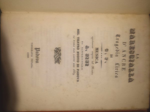 La marescialla d'Ancre, tragedia lirica di G. P. Musica appositamente composta dal maestro A. Nini, da rappresentarsi nel Teatro Nuovo di Padova la fiera del Santo del 1839