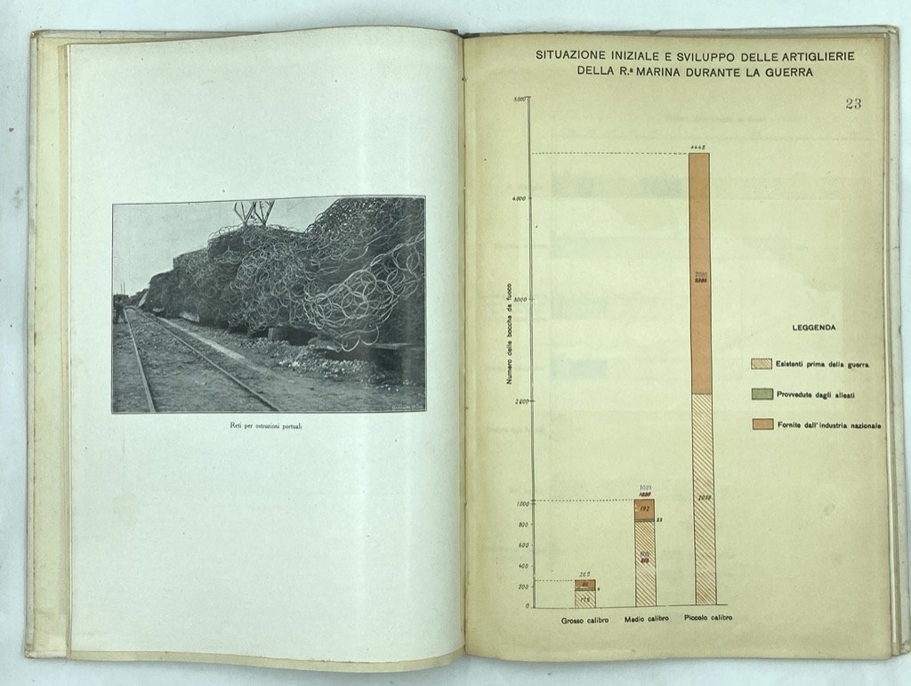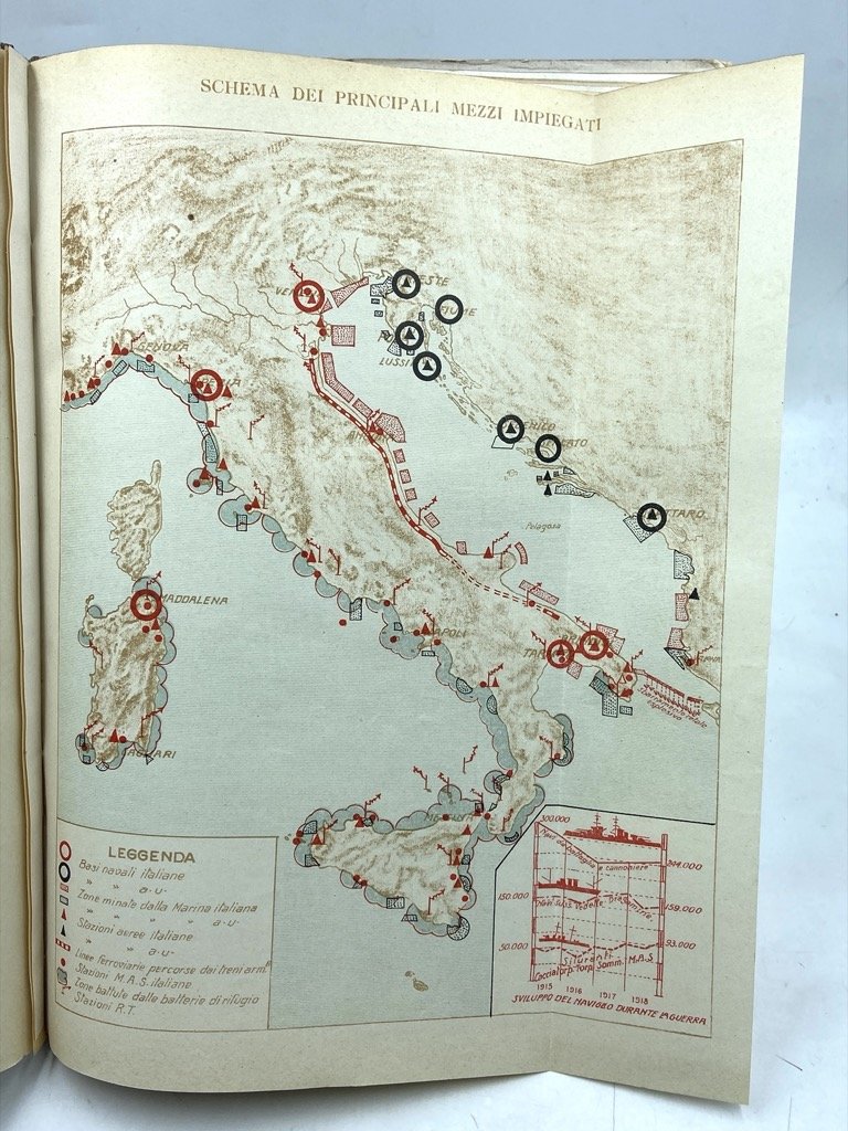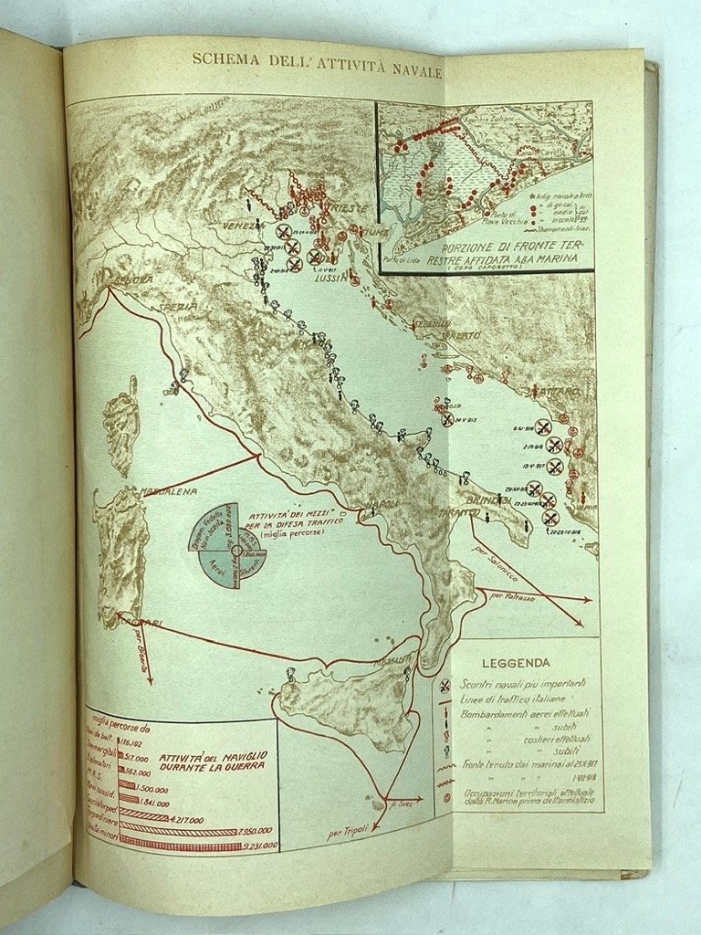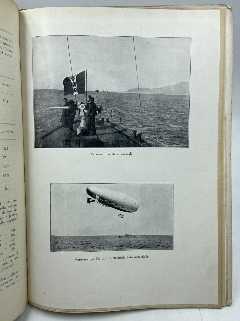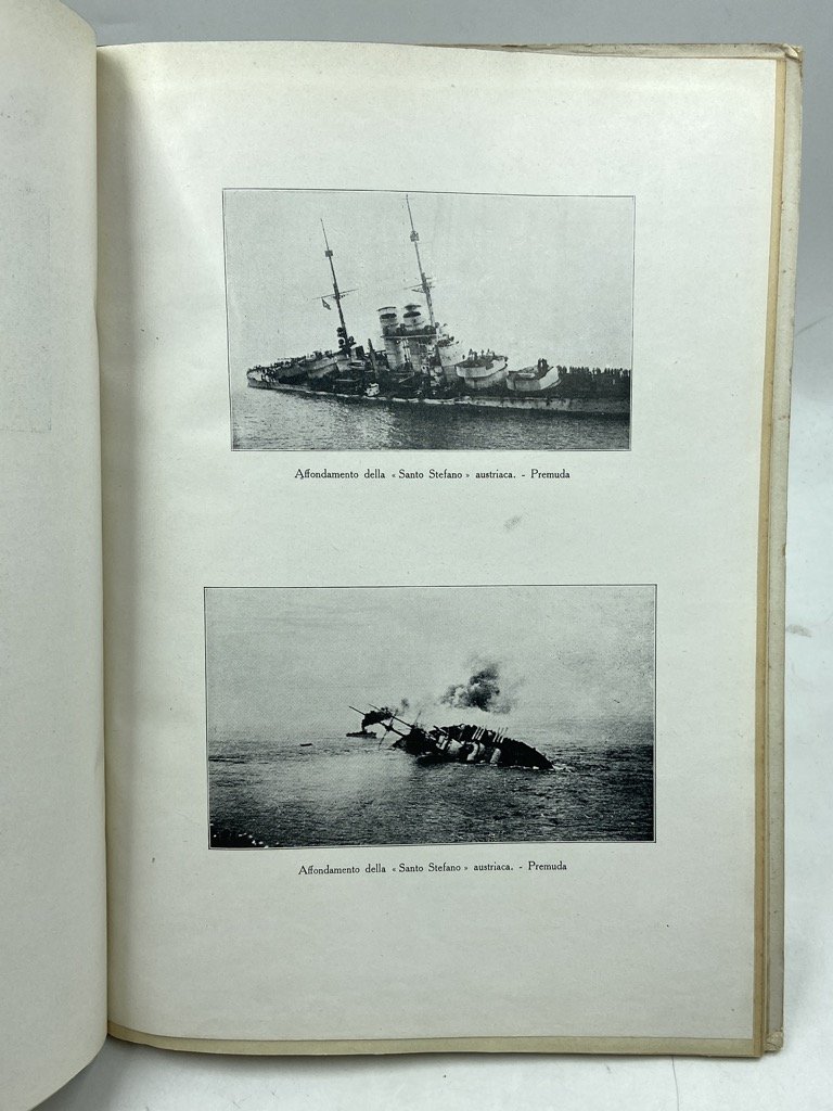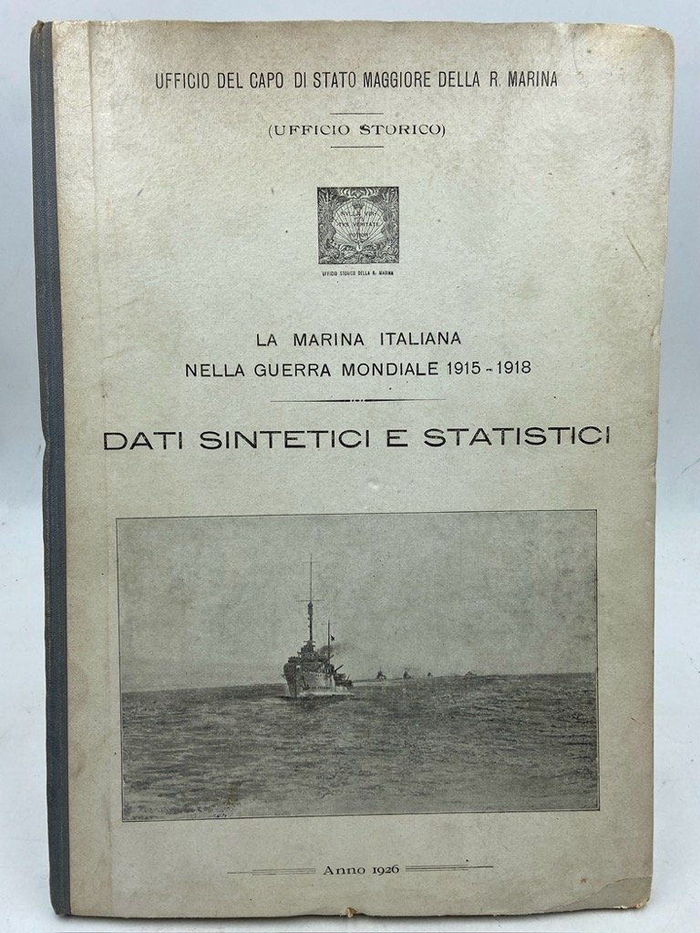 Legatura editoriale in mezza tela con piatti cartonati (colpetti agli angoli), cm 31 x 21.5, pp 35 (1) + tavole. Piccoli difetti sui bordi dei piatti. Firma di proprietà di un Sottocapo della R. Torpediniera «Pontiere», datata Tripoli 1926. Pubblicazione dell’Ufficio Storico della Marina con notizie sulla flotta, le armi e gli uomini della Marina durante la guerra, le battaglie navali e aeree, e un’appendice con decorati e caduti. Alcune tavole con fotografie in nero (costruzione di M.A.S. e sommergibili, insguimento dell’Helgoland, combattimento del 15 maggio 1917 con affondamento della Santo Stefano e Viribus Unitis, ecc, in totale 41 fotografie su 11 tavole fronte retro), e 11 grafici e 7 cartine statistiche a colori.