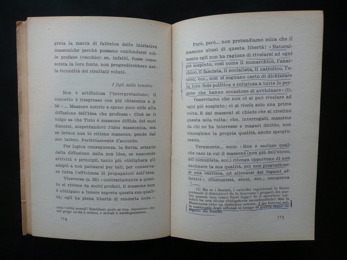 Ostuzzi Attilio, La Massoneria d'oggi" (note ad un suo catechismo clandestino) Pia Società S. Paolo, 1941, cm.18x12, pp. 244, cartonc. ed. Condizioni di conservazione Volume in buono stato con usuali tracce d'uso e del tempo, dorso con un leggero segno di utilizzo. Interni buoni; circa una decina di pagine con qualche sottolineatura e/o brevi segnetti a penna (vedi foto). Violento testo antimassonico e antiebraico SETT10.L0915 "