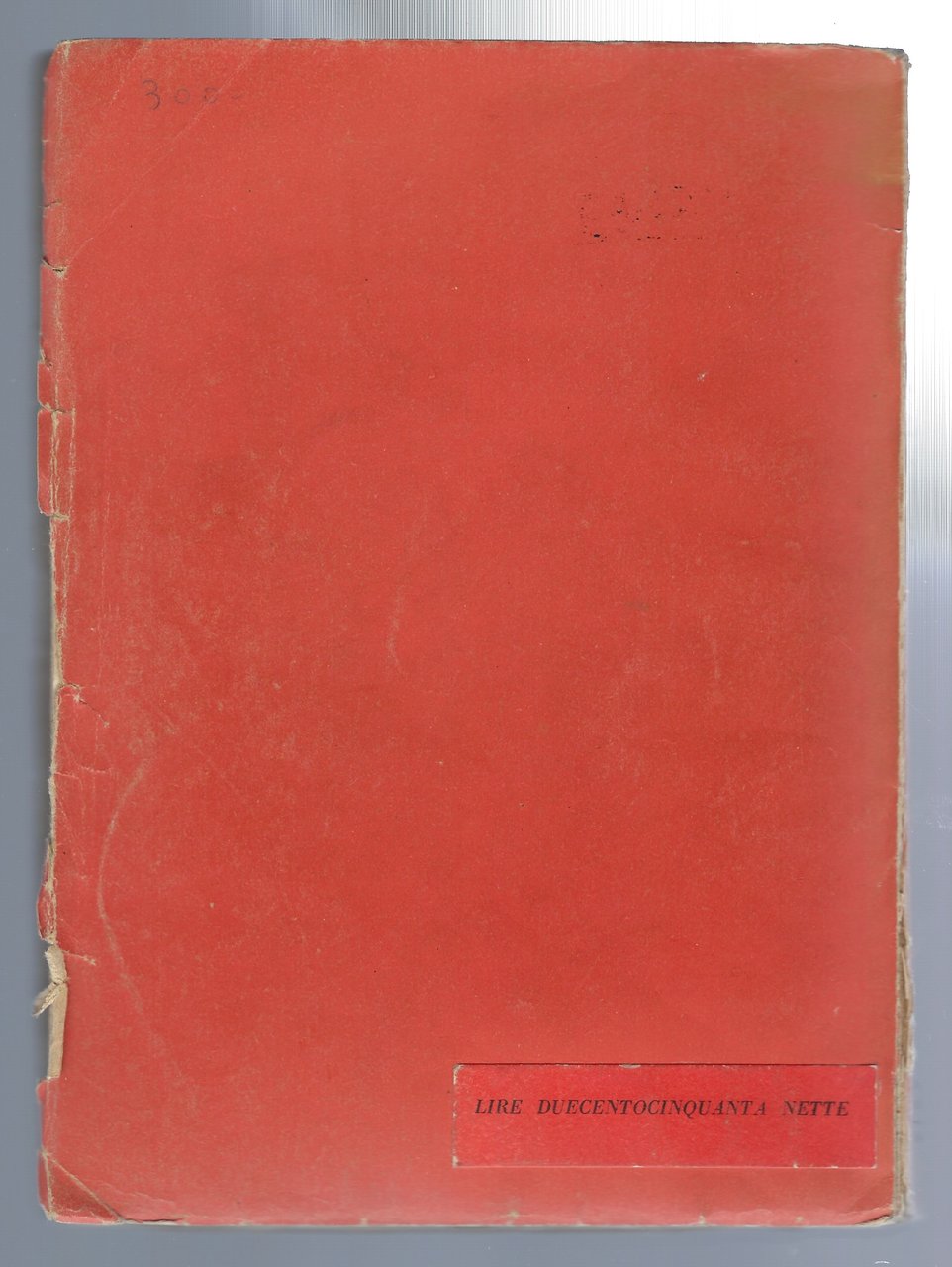 Presenta strappi, pieghe, bruniture ed altri segni vari. Il piatto anteriore risulta parzialmente strappato all'estremità del dorso.