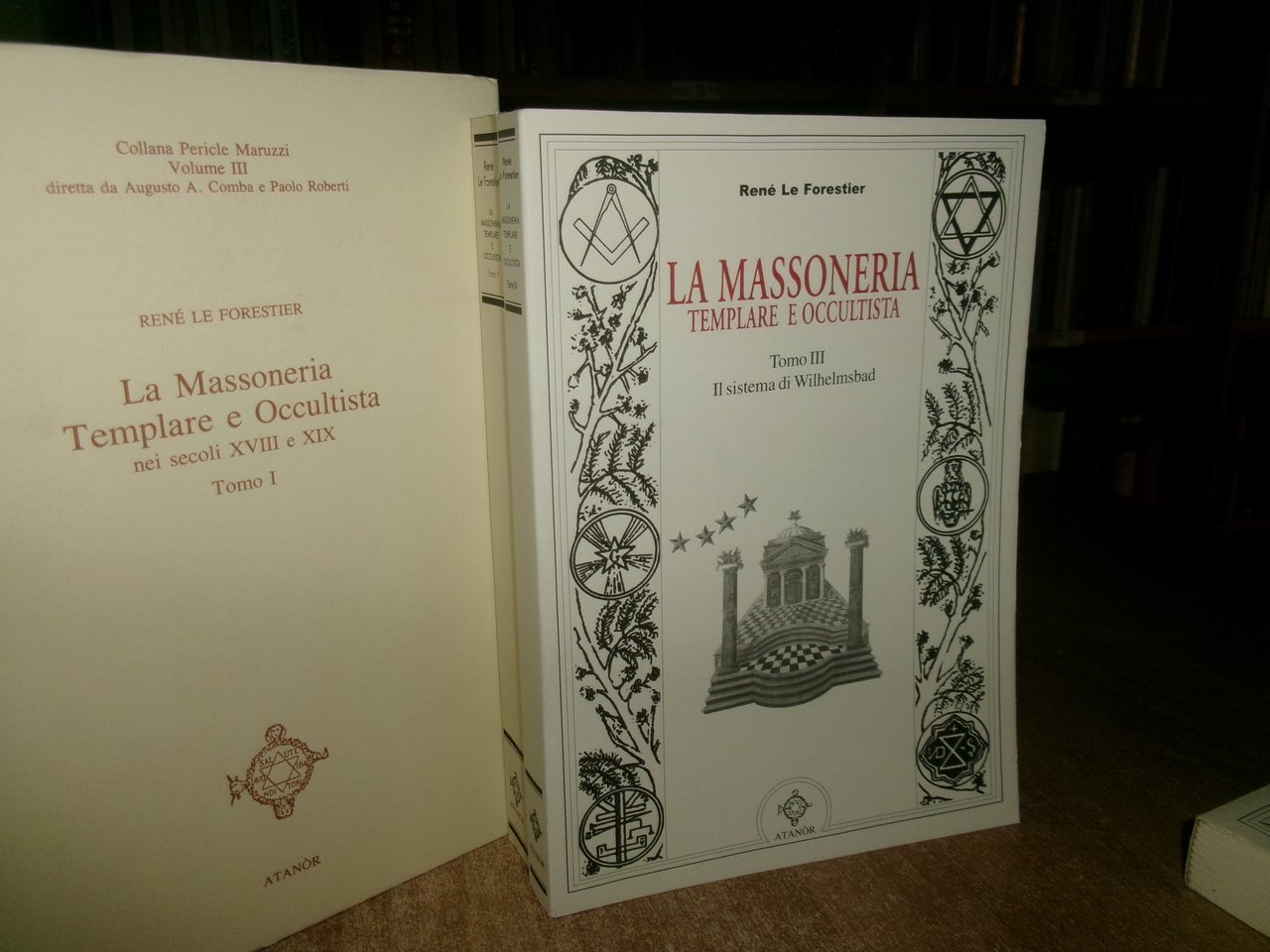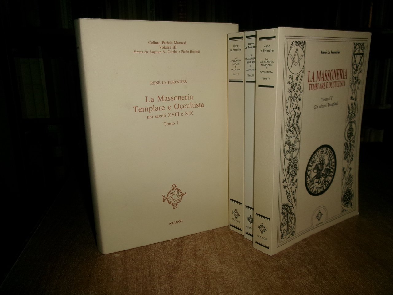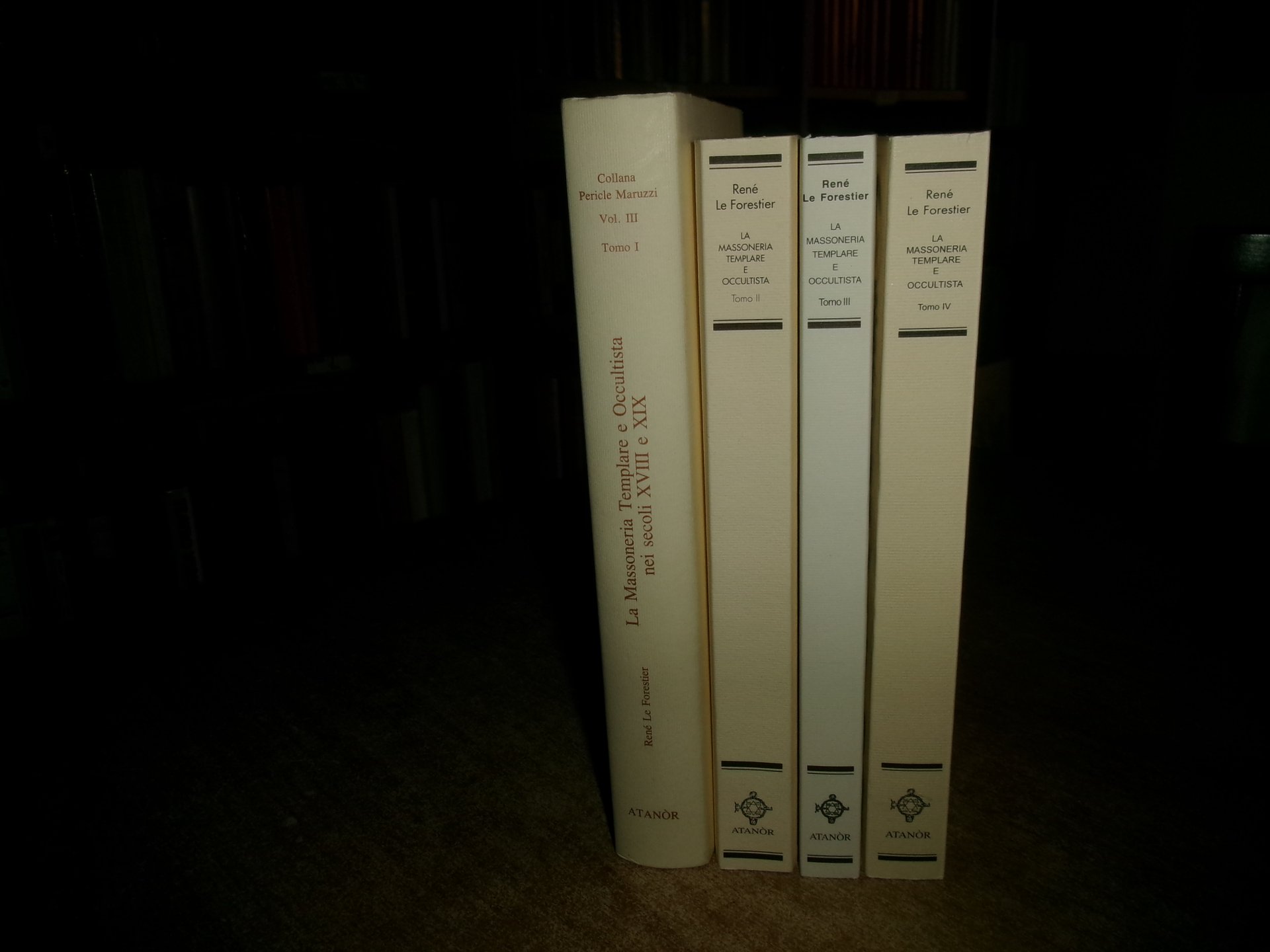 René Le Forestier. Roma, Atanòr, 1991 - 1997 - 2002 - 2006. La Massoneria Templare e Occultista nei Secoli XVIII... 4 volumi in-8°, (3 vol. br.), (1 vol. in tela). Opera così composta: Tomo I. Vol. III. La Massoneria Templare e Occultista nei Secoli XVIII. (xiv), 322, (1) pp. con ritratto di Willermoz. Tomo II. I Cavalieri Beneficienti della Città Santa. 319 pp. Tomo III. Il sistema di Wilhelmsbad. 269 pp. Tomo IV. Gli ultimi Templari. 327 pp. I libri sono di diverse collane ma di uguale argomento. Opera come nuova. Uff. mob. C -