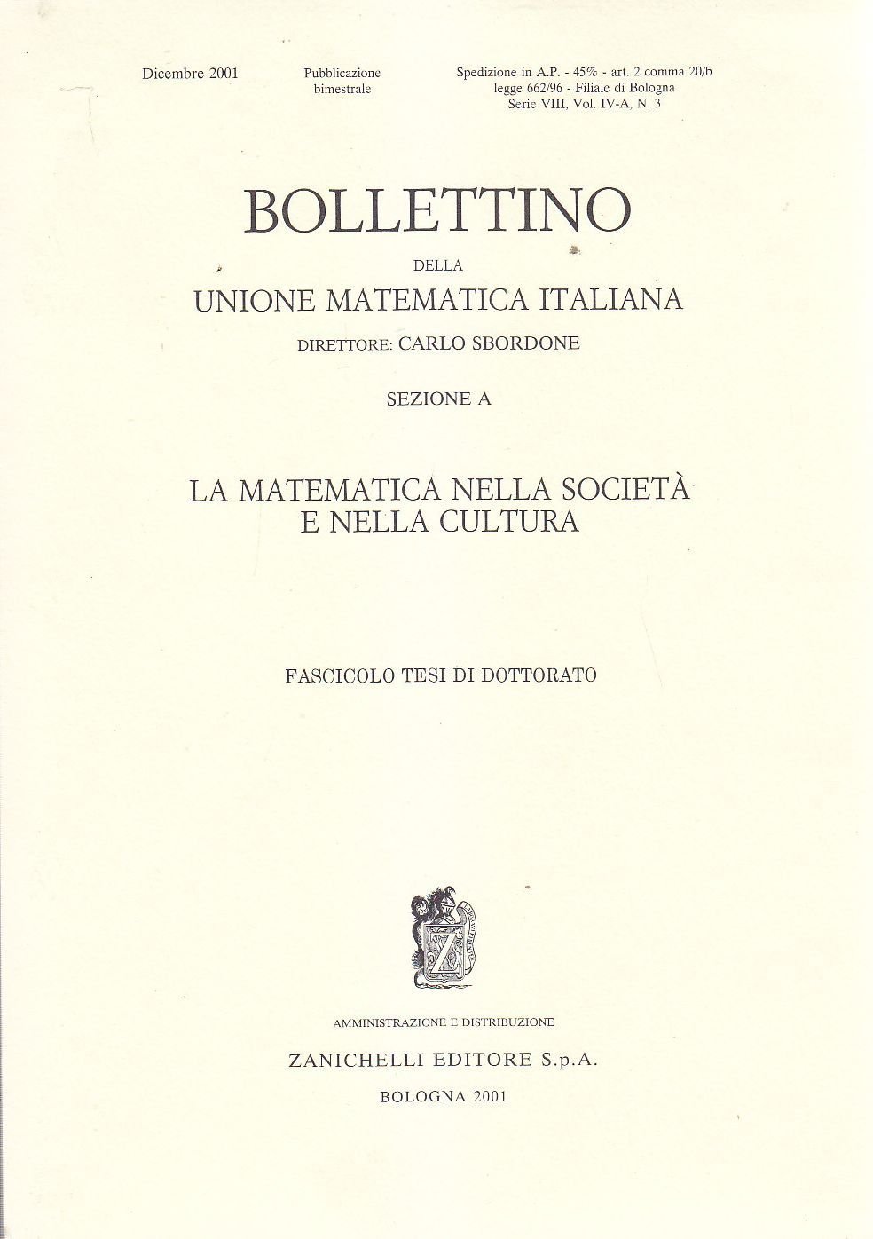 LA MATEMATICA NELLA SOCIETA' E NELLA CULTURA bollettino della unione matematica italiana, Estratti di tesi di dottorato, Serie VIII Vol. IV – A Dicembre 2001. Zanichelli Editore 2001.