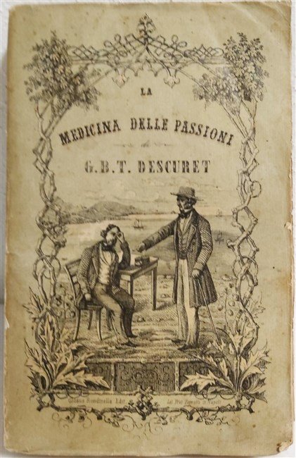 in-8, pp. XLVIII, 606, (2) bross. edit. con bella cop. figurata. Trattato medico in cui l’A. cerca di definire le passioni distinguendole dalle emozioni, ne identifica i segni clinici che le caratterizzano, le cause, le complicazioni, gli effetti sull’organismo e nel sociale. Nella seconda parte dell’opera tratta delle singole passioni suddividendole in “animalesche” (ubriachezza, ghiottoneria, ira, paura, pigrizia, libertinaggio), sociali (amore, ambizione, invidia, gelosia, suicidio, duello, nostalgia, etc.), e intellettuali o “manie” (mania di studiare, dell’ordine, della musica, delle collezioni, del fanatismo religioso). Interessante. Ex libris. Bell’esempl. [057]