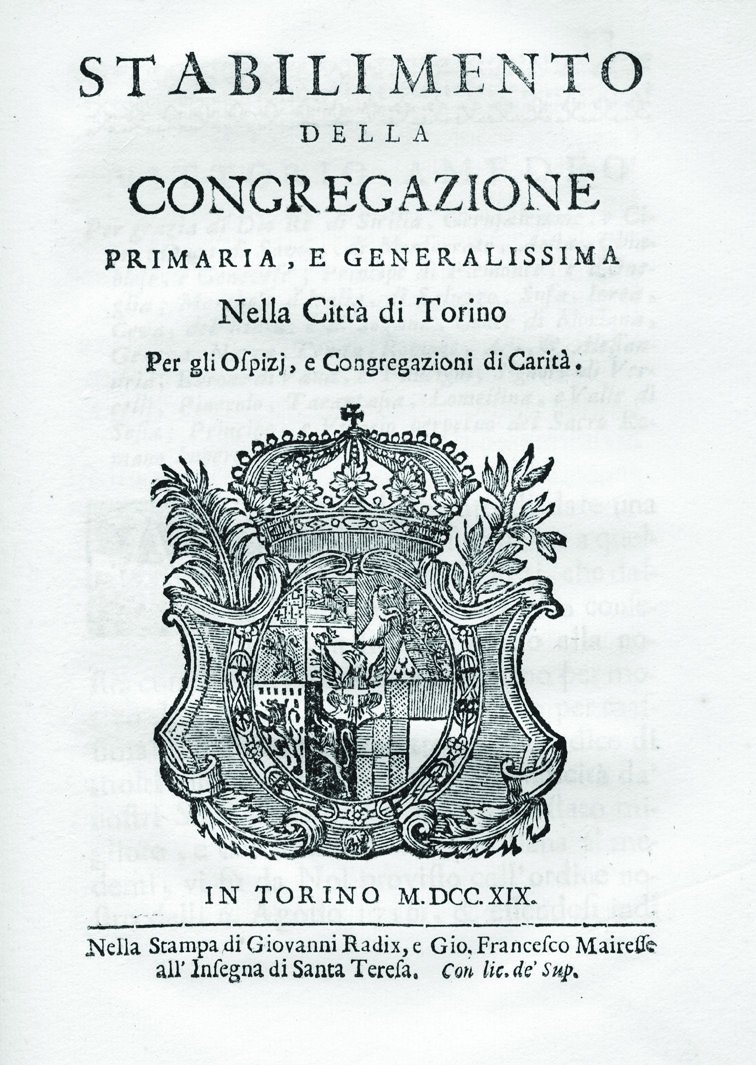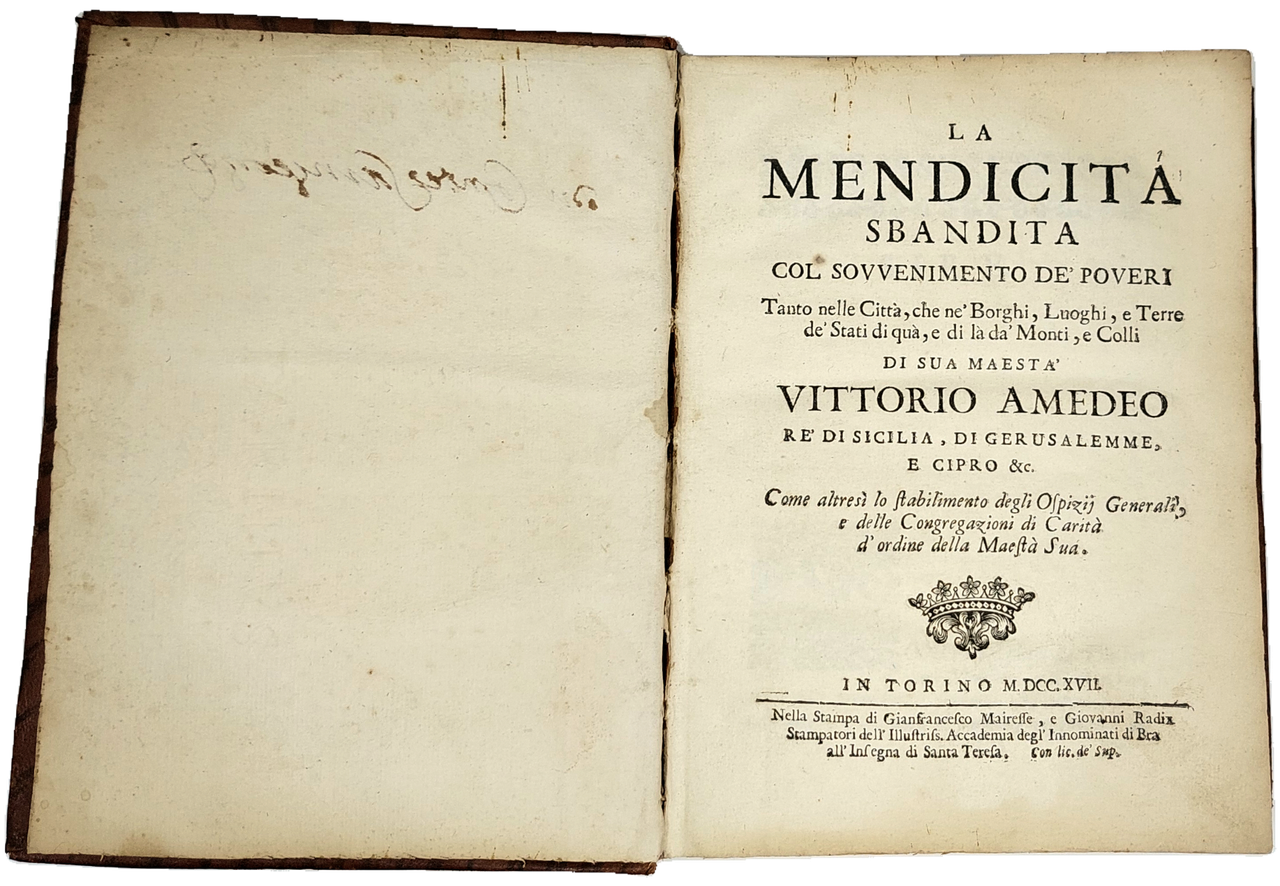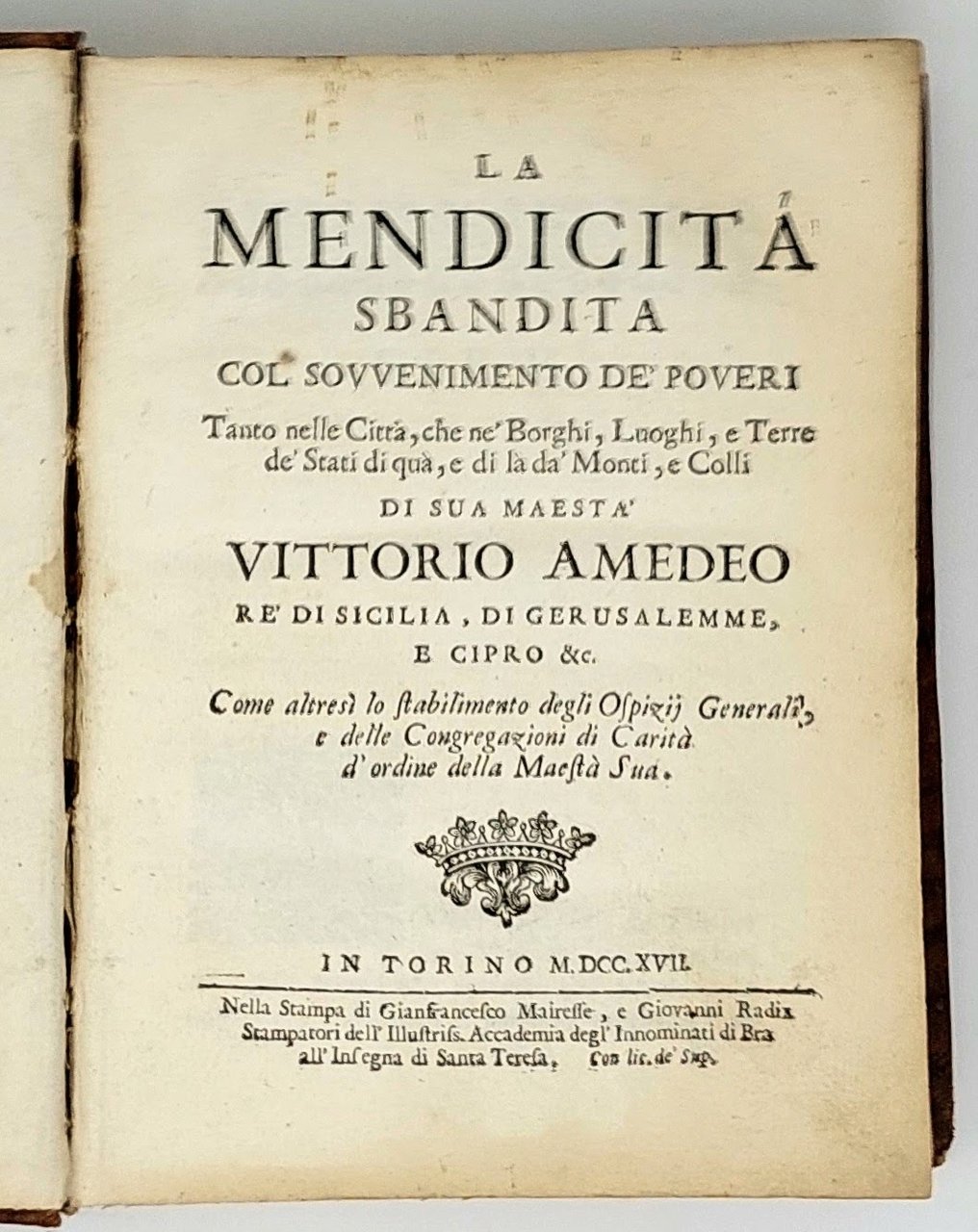 La mendicità sbandita col sovvenimento de' poveri... (Legato con:) Istruzioni e regole degli ospizi generali per li poveri da fondarsi in tutti gli Stati della S. R. Maestà. (e con:) Instruzioni, e regole delle congregazioni di carità... (e con:)  Istruzioni e regole degli ospizi generali per li poveri... (e con:) Stabilimento della Congregazione primari, e generalissima nella città di Torino, per gli ospizi, e congregazioni di Carità.