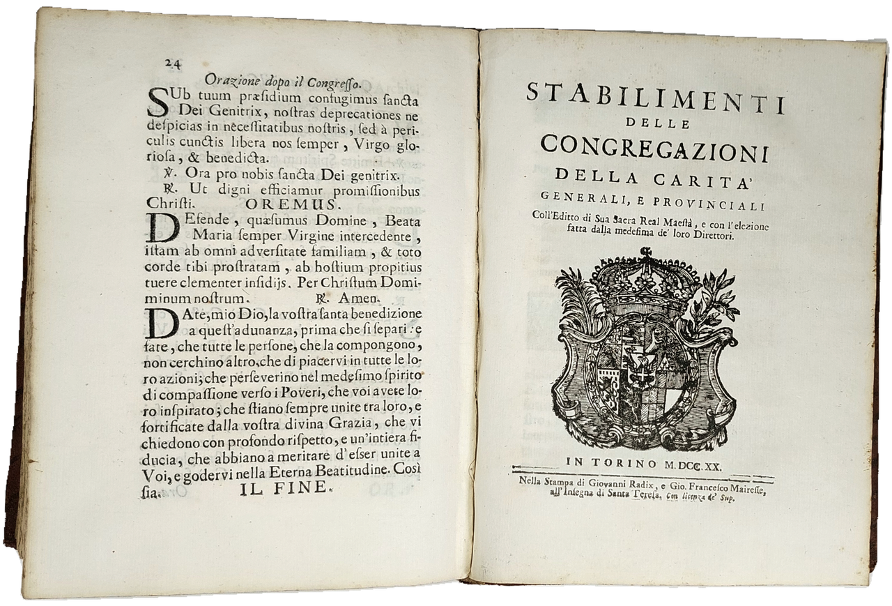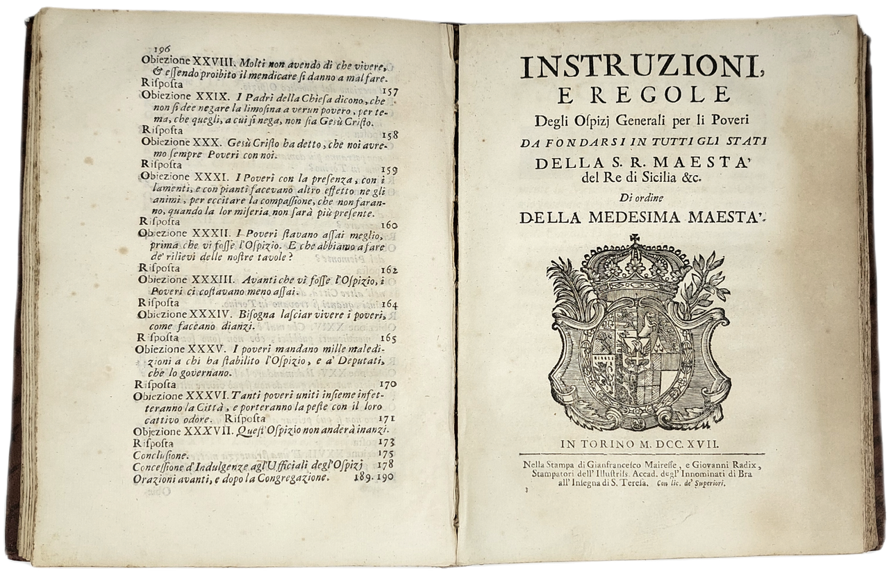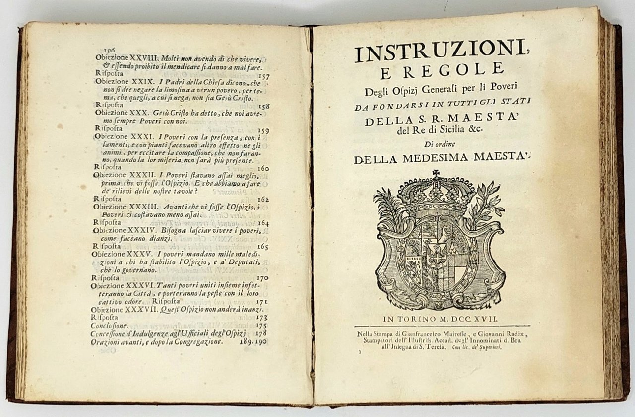 La mendicità sbandita col sovvenimento de' poveri... (Legato con:) Istruzioni e regole degli ospizi generali per li poveri da fondarsi in tutti gli Stati della S. R. Maestà. (e con:) Instruzioni, e regole delle congregazioni di carità... (e con:)  Istruzioni e regole degli ospizi generali per li poveri... (e con:) Stabilimento della Congregazione primari, e generalissima nella città di Torino, per gli ospizi, e congregazioni di Carità.
