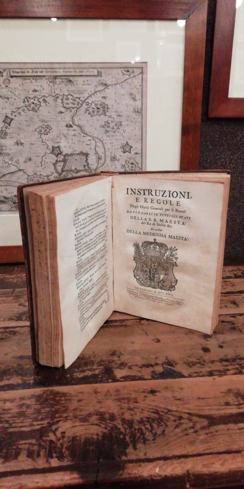 3 volumi in un tomo in-4° (230x160mm), pp. VIII, 196, legatura in piena pelle spugnata coeva con fregi dorati al dorso a 5 nervi. Tagli gialli. Fregio tipografico e forma coeva di possesso al foglio del titolo. Testatine, cul-de-lampe e capolèttere ornati. Dedicatoria a Vittorio Amedeo II. Lievi difetti alla legatura peraltro fresco e marginoso esemplare. Edizione originale di questo fortunato trattato, molte volte ristampato e tradotto, sull'assistenza ai poveri e i metodi di eliminazione del fenomeno della mendicità. Il nome dell'autore, vissuto tra il 1646 e il 1724, e appartenente alla Compagnia di Gesù, è contenuto nella dedicatoria. Essendo stati raccolti i mendicanti di Torino nell'Ospedale di Carità, il Guevarre venne deputato a visitare le città e le terre delle Provincie per istituire congregazioni che, senza rinchiudere i poveri in 'alberghi di carità', somministrassero loro la razione minima di cibo necessaria ad impedire l'accattonaggio. In seguito, sotto la supervisione della Compagnia di Gesù, le congregazioni locali furono poste sotto la rettorìa di una congregazione primaria, la Generalissima (cfr. Carutti, Storia del Regno di Vittorio Amedeo II, cap. XXI). Bell'esemplare. Qualche brunitura. Segue: 'Instruzione e Regole degli Ospizj Generali per li Poveri da fondarsi in tutti gli Stati della S. R. Maestà del Re di Sicilia &c. di ordine della medesima Maestà', Torino, Mairesse e Radix, 1717. Pp. 144, (4). Stemma in rame al titolo. Segue: 'Instruzioni, e Regole delle Congregazioni di Carità da fondarsi.ove non possono farsi Ospizi Generali per li poveri', id., 1717. Pp. 52, (4). Stemma in rame al titolo. Le 'Instruzioni' che seguono l'opera del Guevarre completano la documentazione relativa ai provvedimenti adottati a Torino al fine di eliminare la pubblica questua. Cat. Einaudi, 2800, 5106-7. Manno, I, 3075 e sgg. Sirugo, nn. 30-31. Cossa, p. 92, n. 24. Manca alla Kress e all'Higgs.