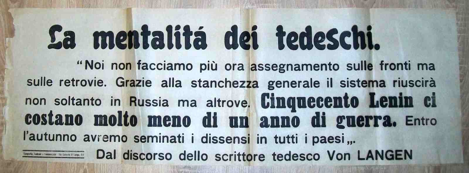 Manifesto originale di propaganda irredentista - patriottica. Cm. 100 X 36. Il titolo: La mentalità dei tedeschi è seguito da una frase dello scrittore tedesco Von Langen.