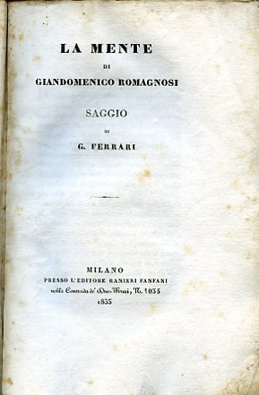 In-8°, pp. (4), 151, (4), brossura editoriale gialla con pecetta a stampa del tempo al piatto: 'Il presente Saggio sulla mente di G. D. Romagnosi fu impresso a spese di Angelo Castelli'. Fioriture lievi, ma buon esemplare in barbe ed intonso. Prima edizione. Annota Franco Della Peruta in D.B.I., XLVI, 1996: 'Tornato a Milano, più che dai codici e dalle pandette egli si senti subito attratto dalla filosofia, che coltivò sia con assidue letture, incentrate su David Hume, su John Locke e su Giovan Battista Vico. sia con le conversazioni che riunivano nella casa di Gian Domenico Romagnosi le migliori intelligenze della gioventù milanese del tempo, da Carlo Cattaneo a Cesare Cantù ai cugini Defendente e Giuseppe Sacchi. E al giurista suo maestro, appena defunto - dalla cui attenzione per i rapporti regolatori dell'azienda sociale' deriverà il suo precoce interessamento per i problemi relativi all'assetto di una società più giusta - il giovane Ferrari dedicò il suo primo scritto significativo, La mente di G. D. Romagnosi (Milano 1835, dapprima apparso nella Biblioteca italiana, su cui aveva pubblicato nello stesso anno una recensione molto critica al Rinnovamento della filosofia italiana di T. Mamiani): un'analisi del pensiero romagnosiano interpretato alla luce della 'corrispondenza de' suoi sforzi coi bisogni d'un'epoca che deve progredire colla scienza istessa del progresso' e della concezione dell'uomo come essere sociale e non individuale. Accanto all'influenza di Romagnosi, che gli appariva come il sistematore delle idee del '700 illuminista, l'uomo della ragione e della logica analitica, operò profondamente in quegli anni sul F. l'influsso del pensiero di Vico, visto come il genio precorritore, armato delle sue capacità sintetiche e fantastiche'.
